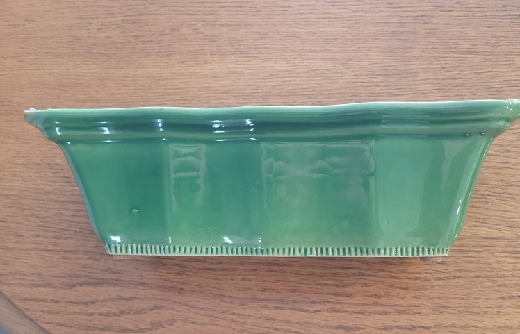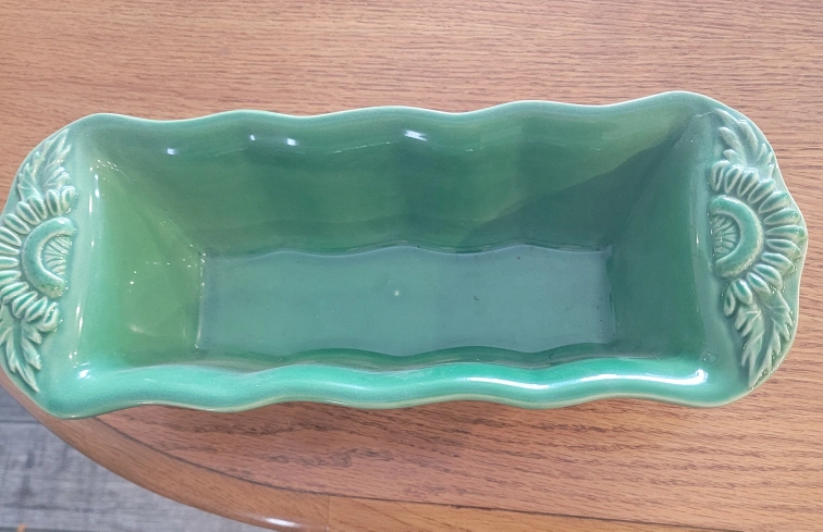 Unique rectangular baking dish. Features a wavy design and floral accents on the ends. Green glaze. Perfect for bread or other small dishes.