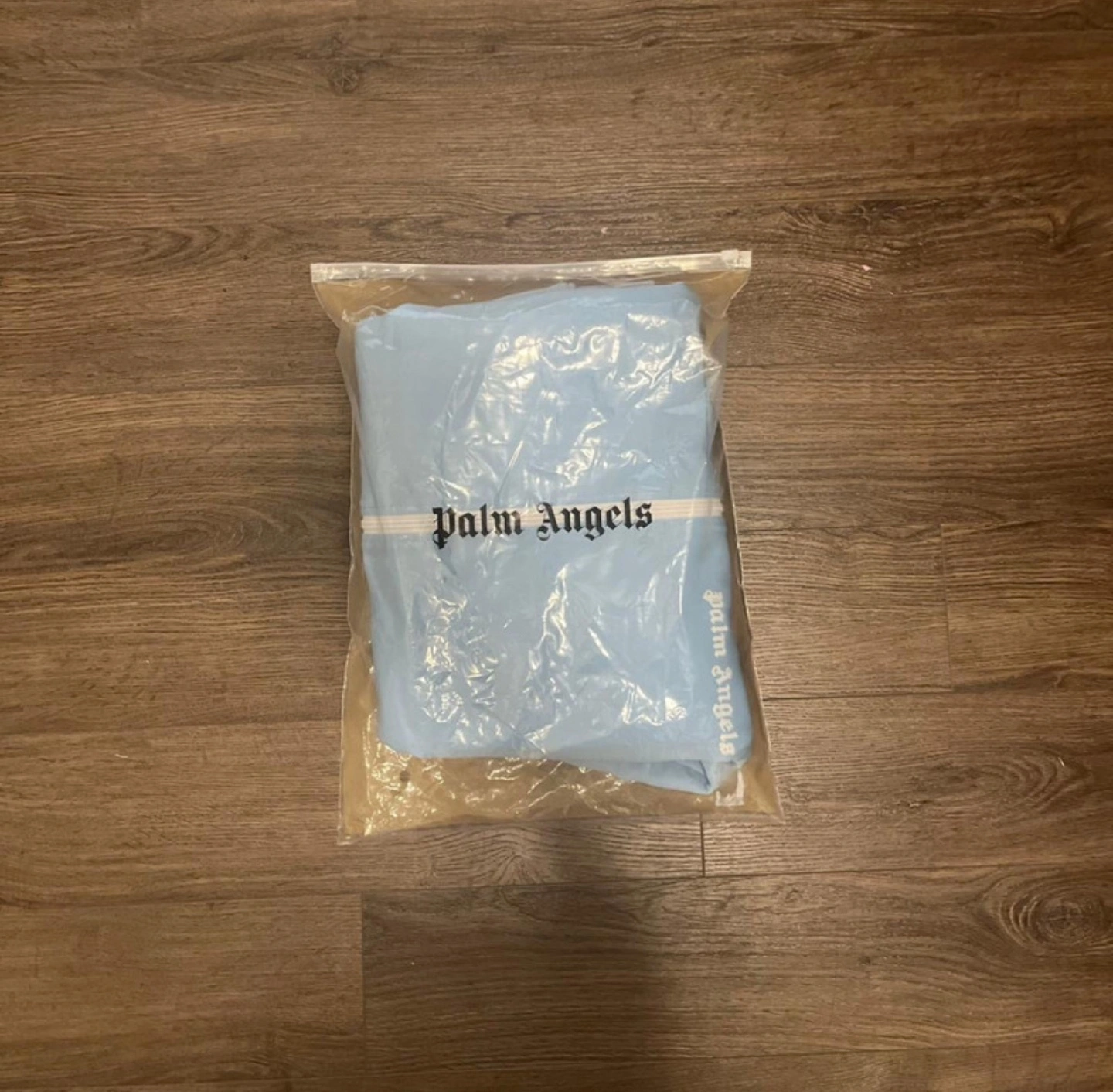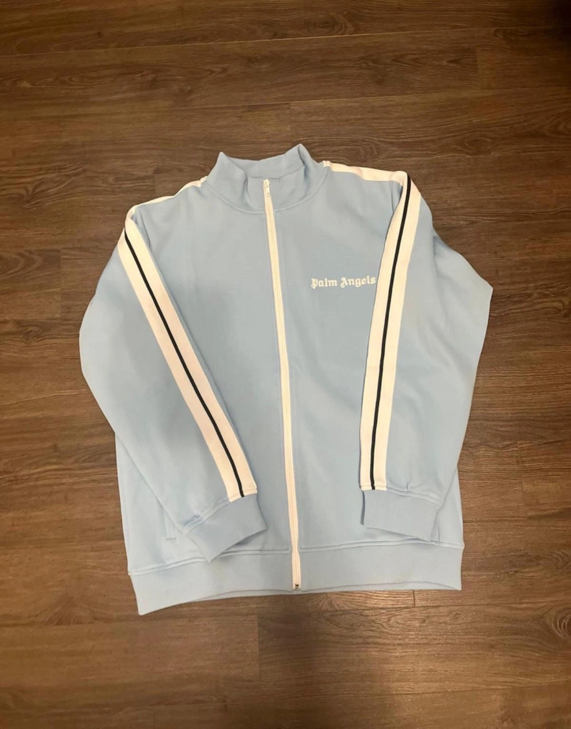 Men's Palm Angels track jacket. Light blue colour. Features white and black stripes on the sleeves. Zip closure. Excellent condition.