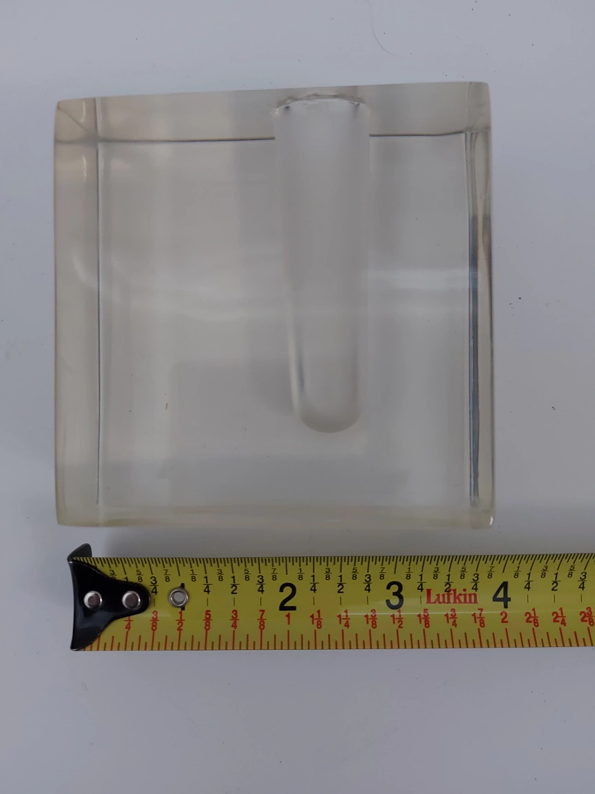 Small, square, clear lucite bud vase. Perfect for a single stem or small bunch of flowers. Modern and minimalist design.