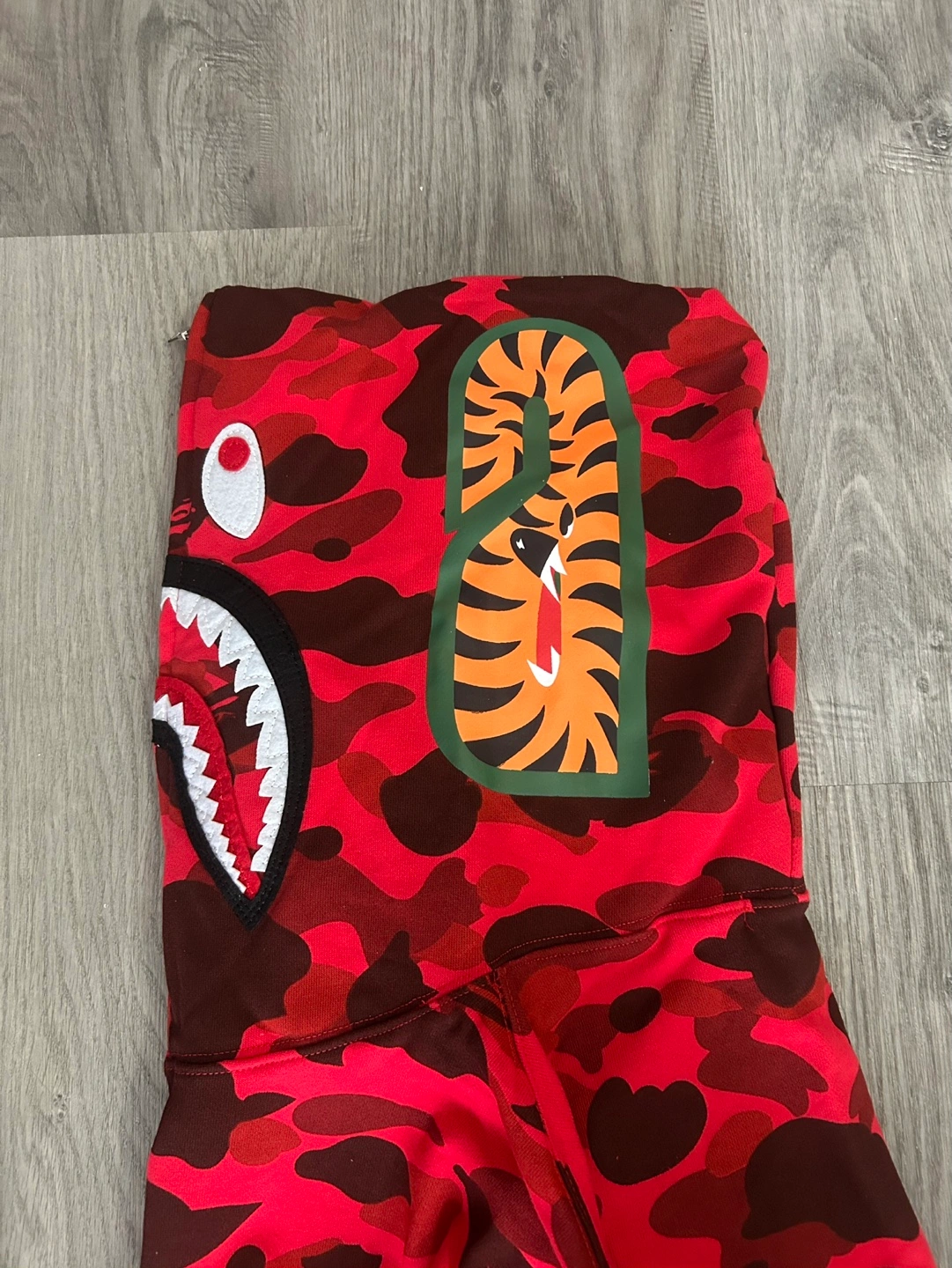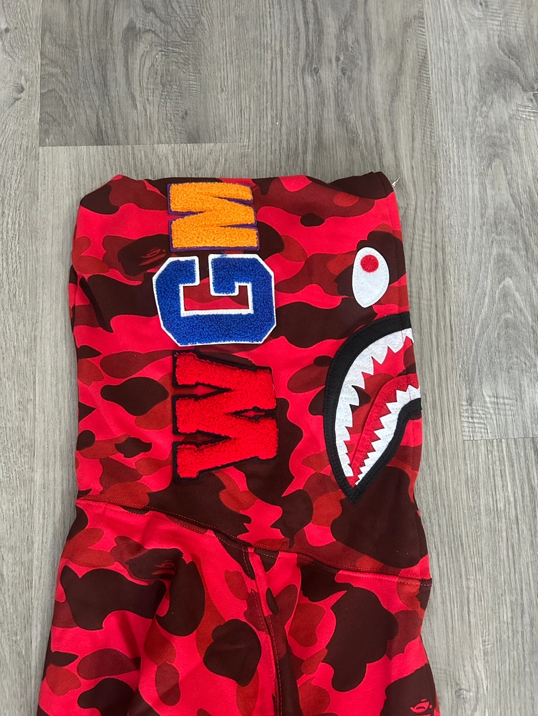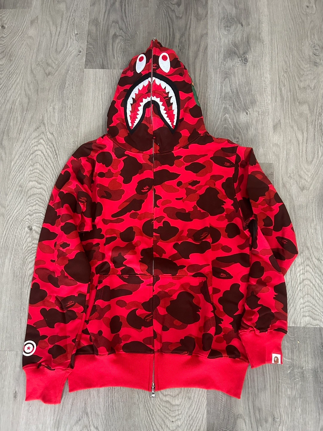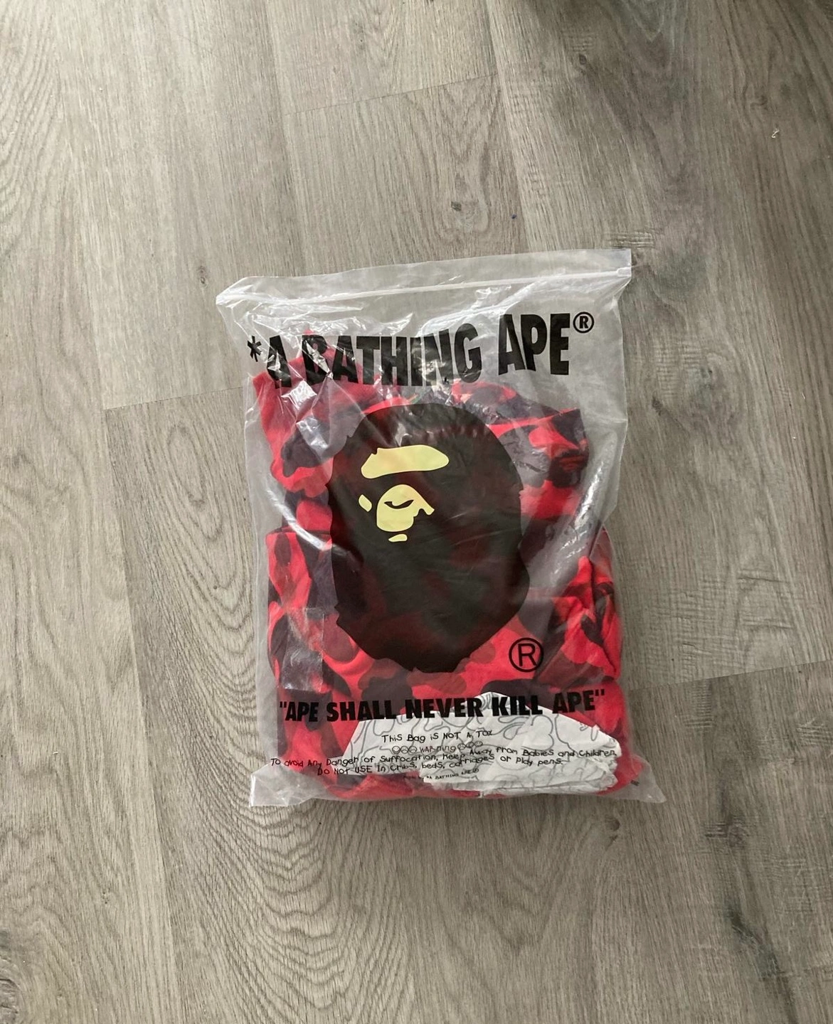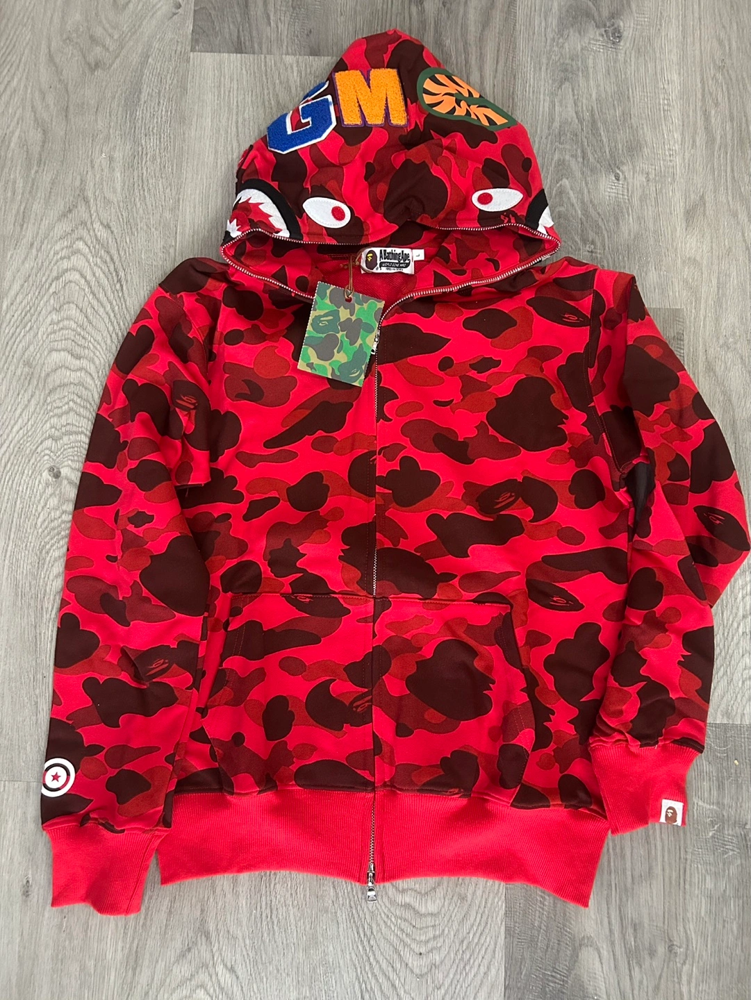 Men's size large red camo zip-up hoodie. Features a large Ape shark face on the hood and colourful lettering. Excellent condition, brand new with tags.