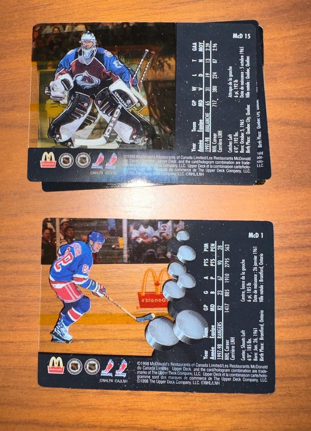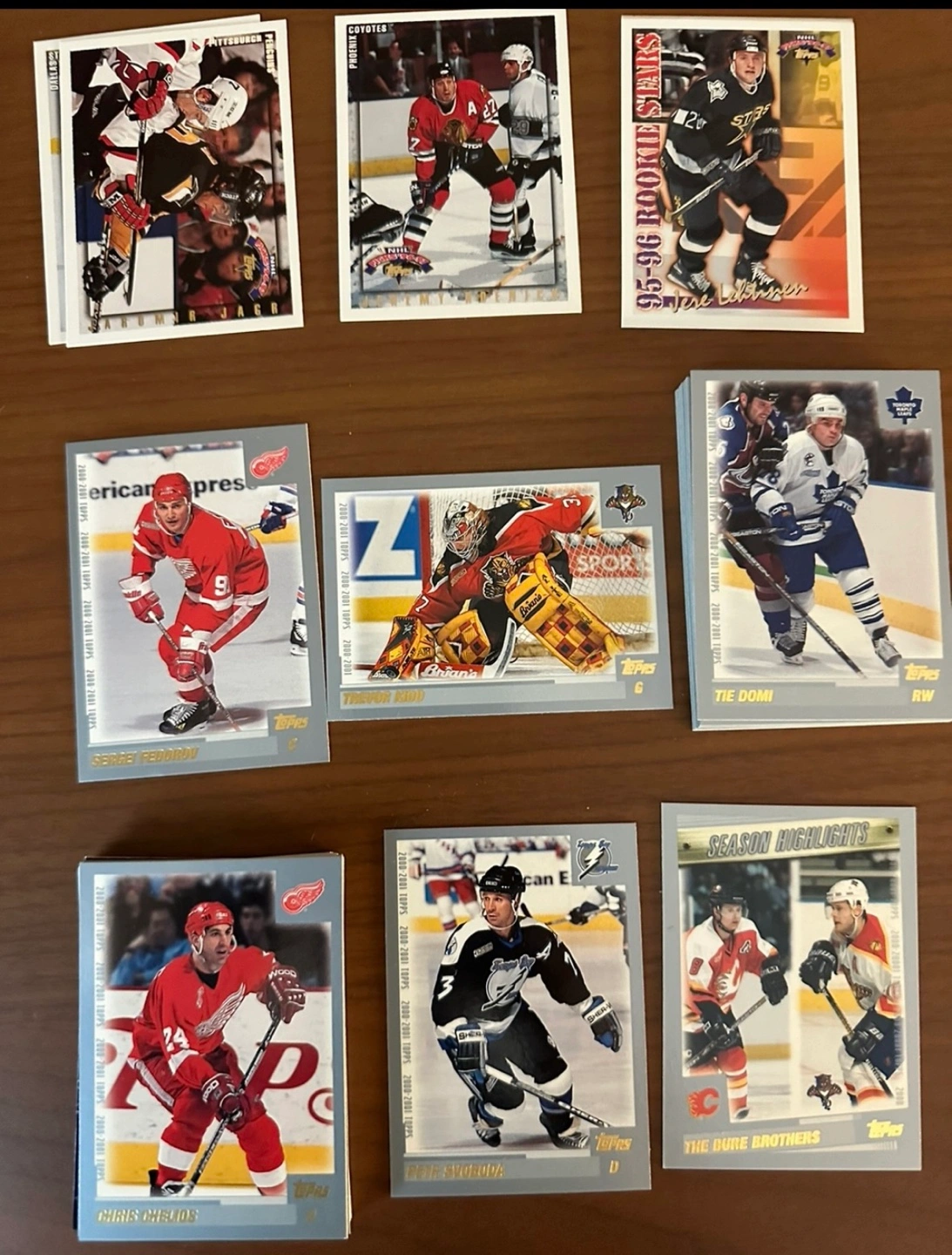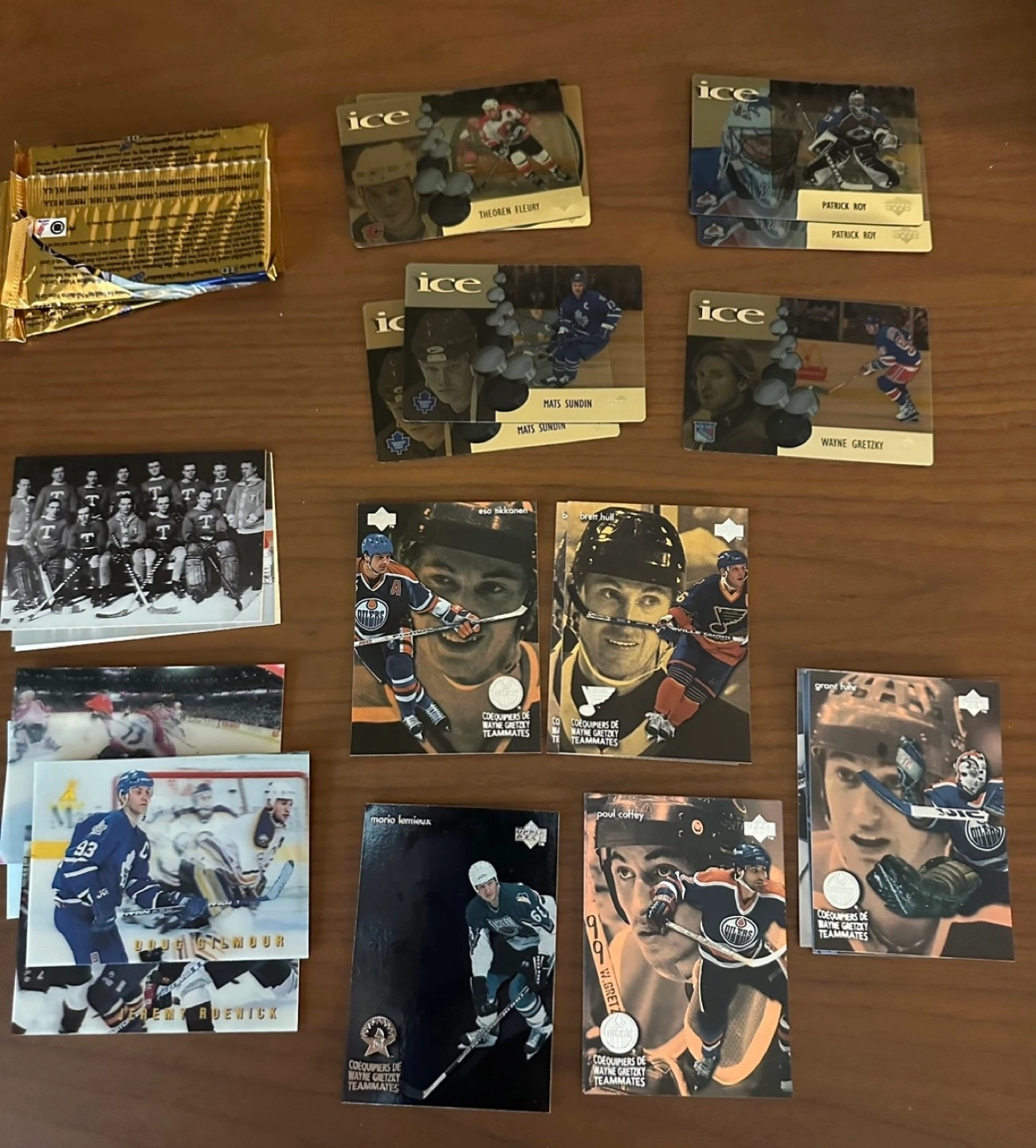 This lot contains about 80-100 cards from Topps, Fleer, Score and McDonald’s (Upper Deck and Pinnacle). The players featured in this lot are Wayne Gretzky, Tie Domi, Jaromir Jagr, Trevor Kidd, Sergei Fedorov, and Chris Chelios. Packages have been opened.