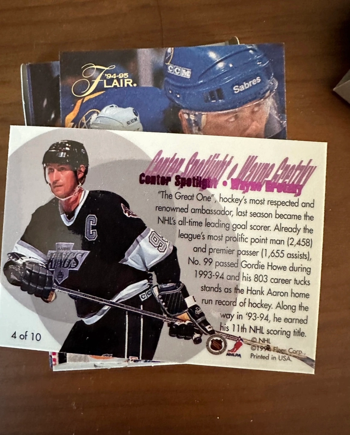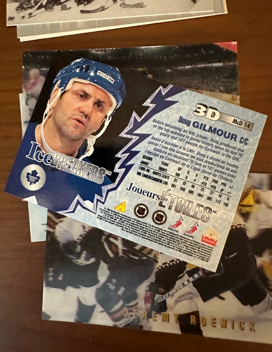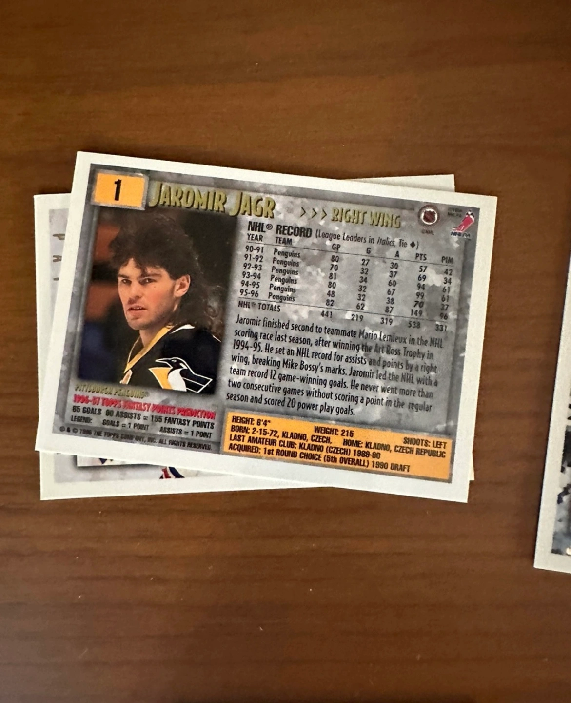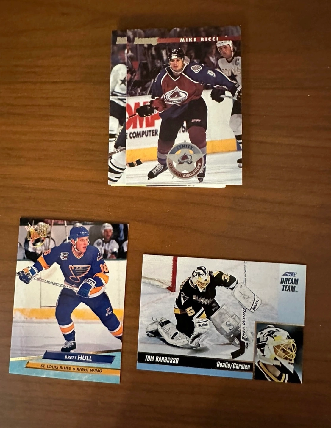 This lot contains about 80-100 cards from Topps, Fleer, Score and McDonald’s (Upper Deck and Pinnacle). The players featured in this lot are Wayne Gretzky, Tie Domi, Jaromir Jagr, Trevor Kidd, Sergei Fedorov, and Chris Chelios. Packages have been opened.