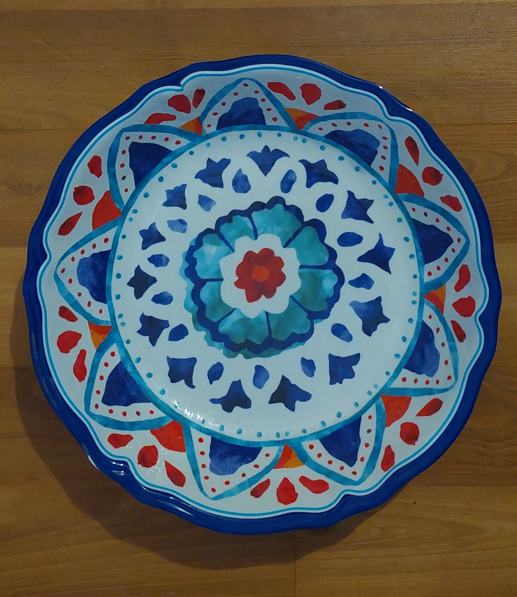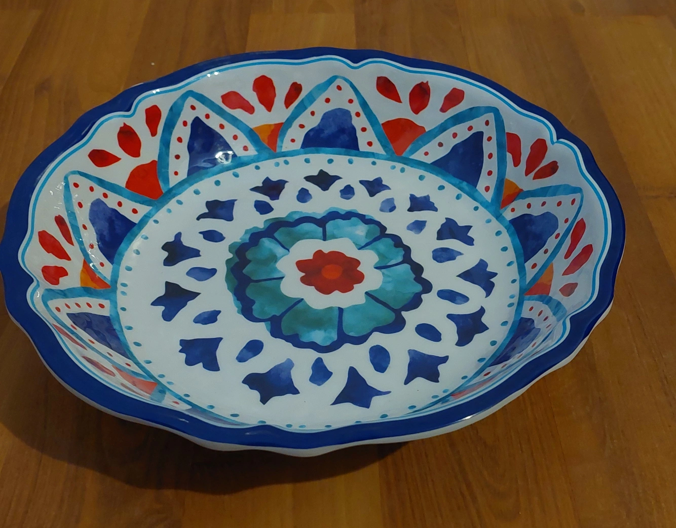 Large melamine serving bowl. Beautiful blue, red, and white floral pattern. Scalloped edge. Perfect for parties or everyday use. New