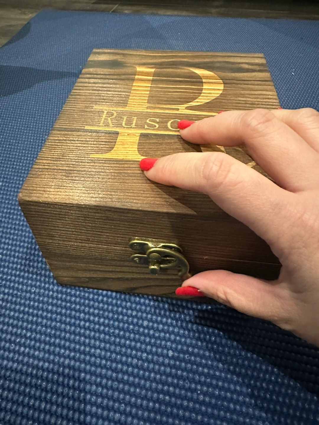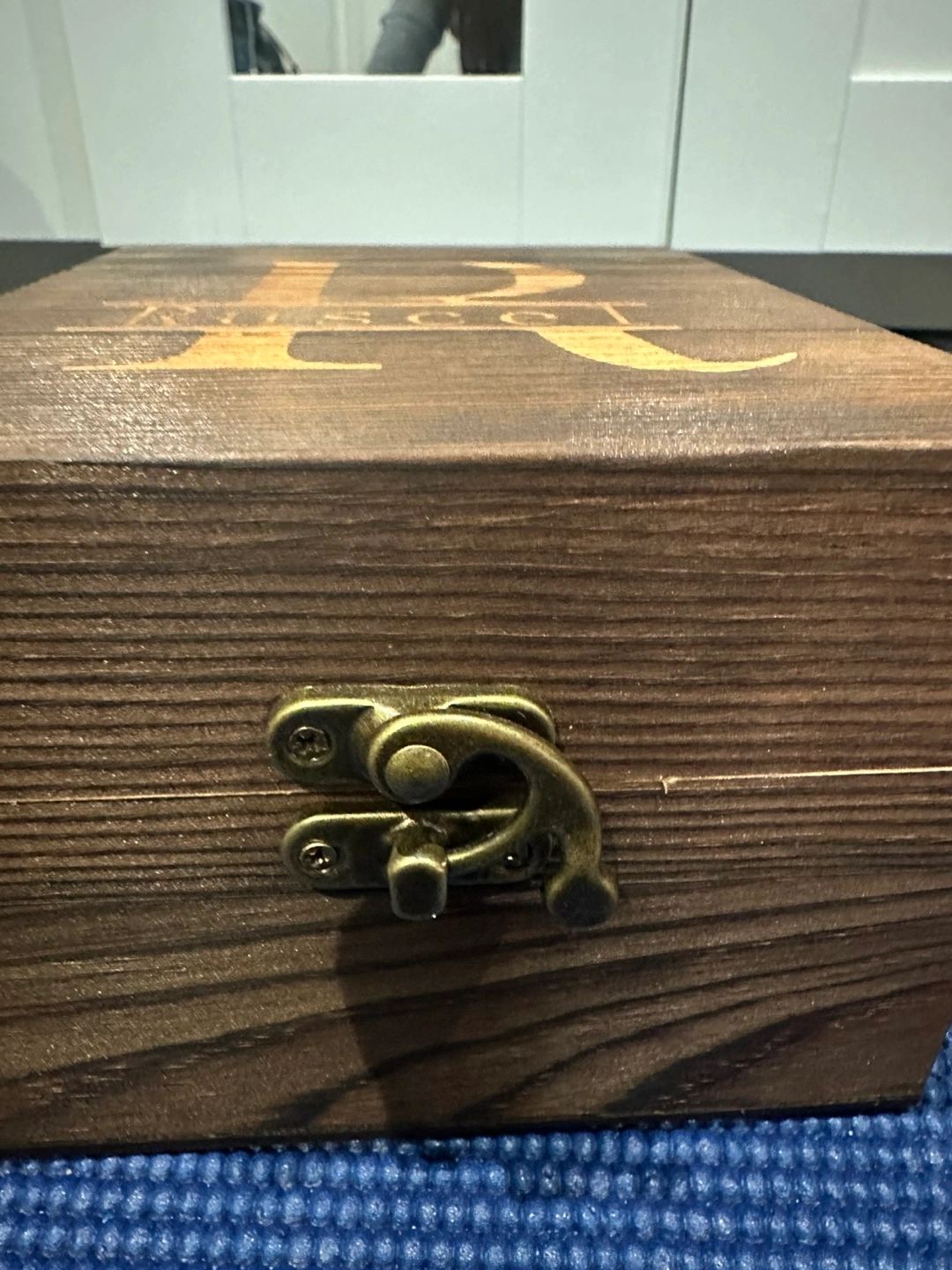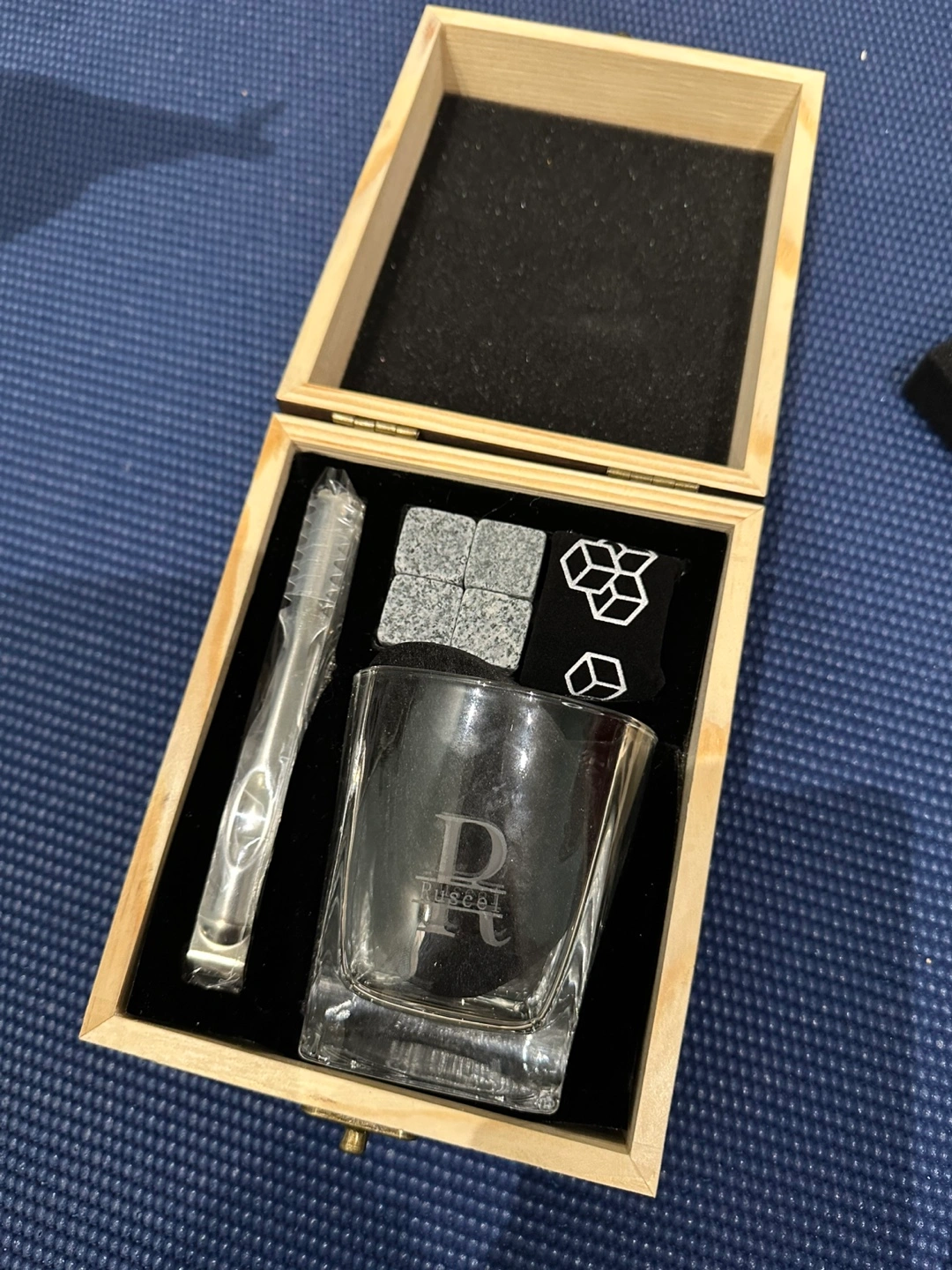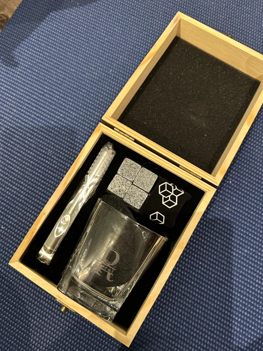 Wooden box set. Contains rocks glasses, whiskey stones, and a pair of tongs. Engraved with initial R. Perfect gift.