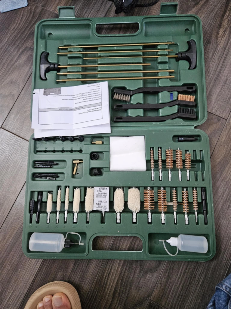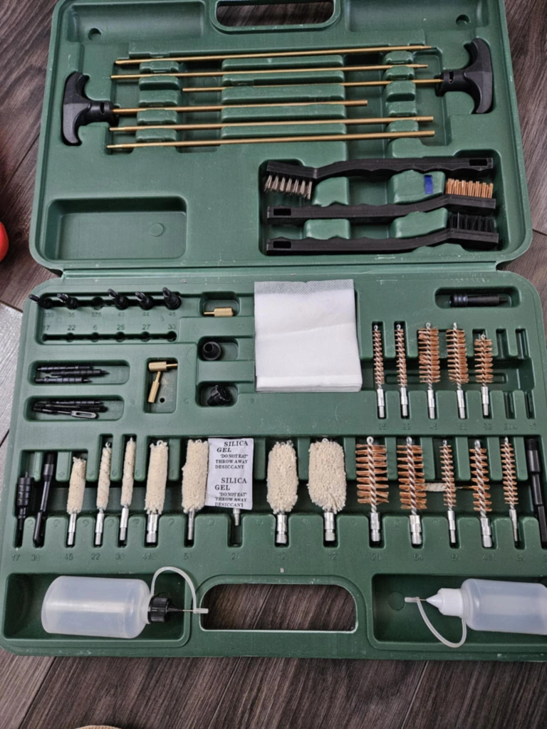 Complete gun cleaning kit. Includes various brushes, rods, and other tools. Stored in a convenient carrying case. Perfect for firearm maintenance selling $60