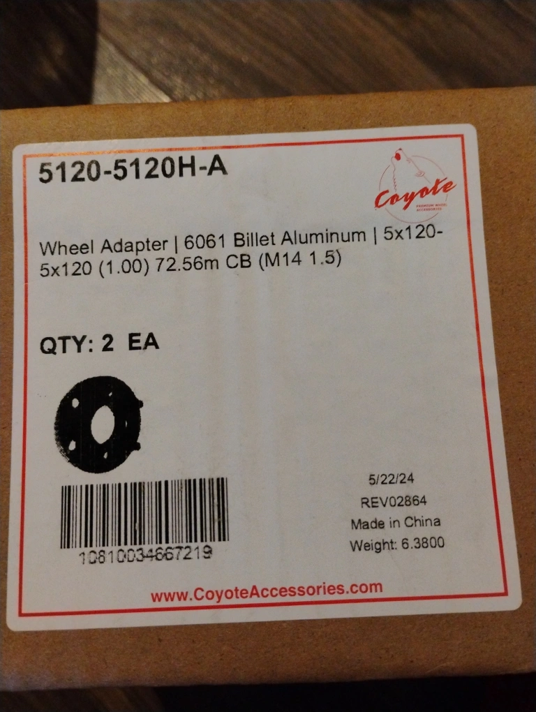 Two 5x120 wheel adapters. 6061 billet aluminum construction. 5x120 bolt pattern. 72.56mm centre bore. M14 x 1.5 studs. Made in China.