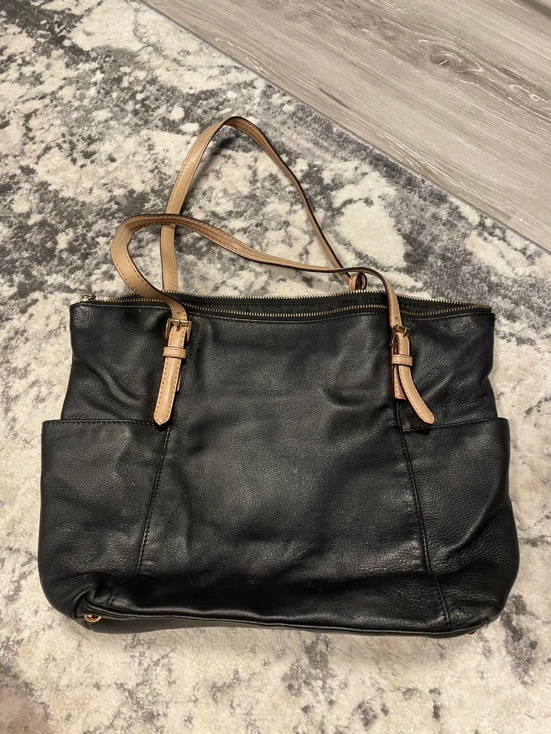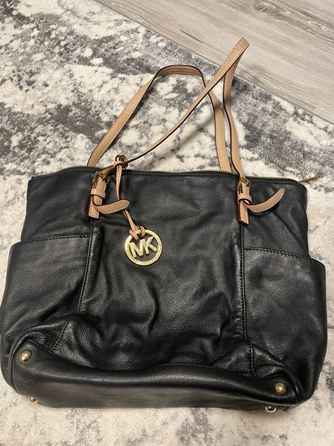 Black leather tote bag. Two shorter handles. Zip closure. Multiple pockets. Interior features Michael Kors branding. Gold hardware.