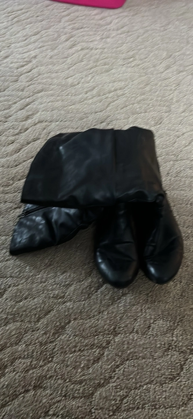 Pair of black, faux leather knee-high boots. Slouchy style. Good for fall