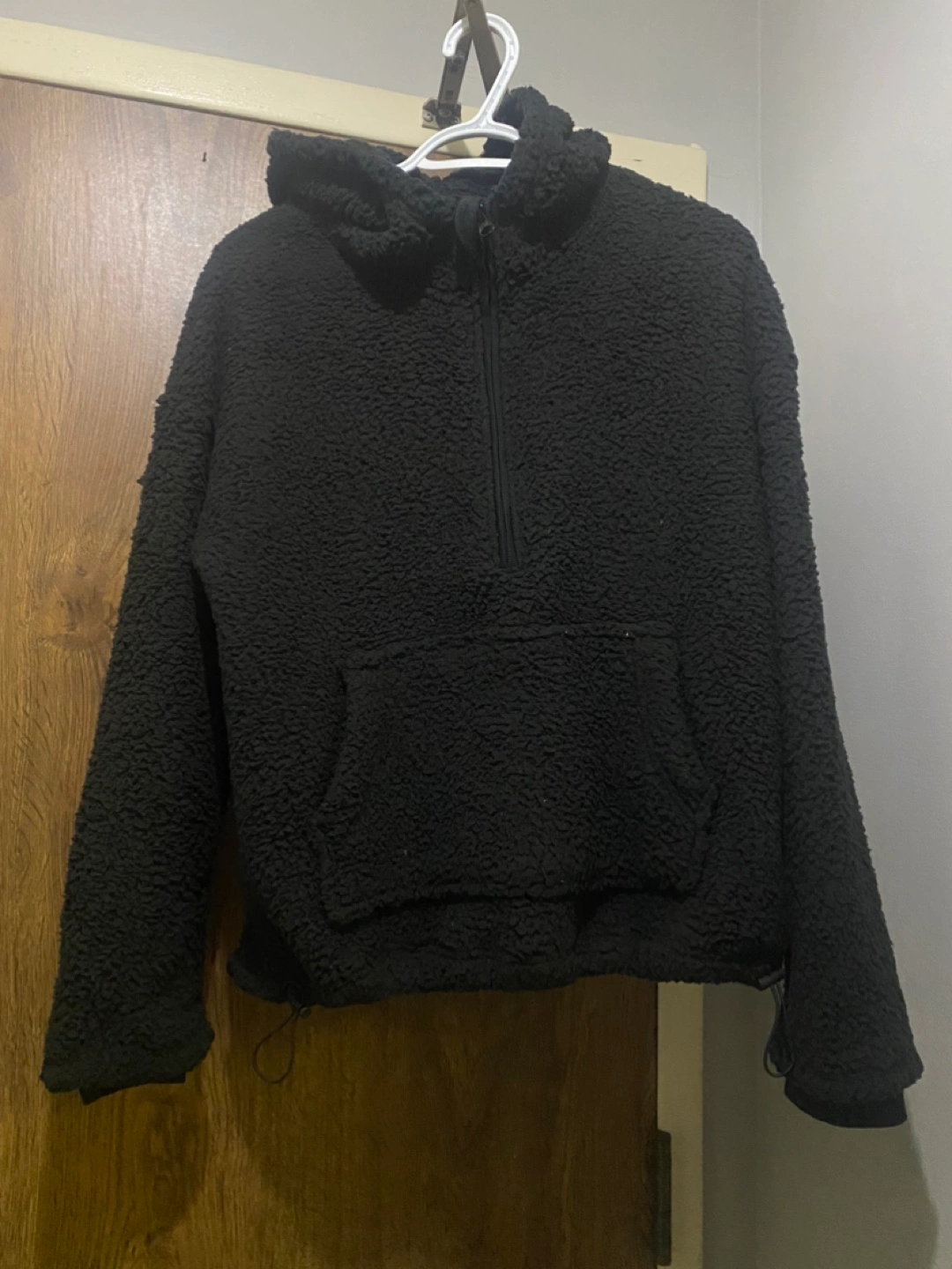 Cozy black teddy fleece hoodie. Half zip closure. Kangaroo pocket. Drawstring hem. Size Medium. Excellent condition, brand new