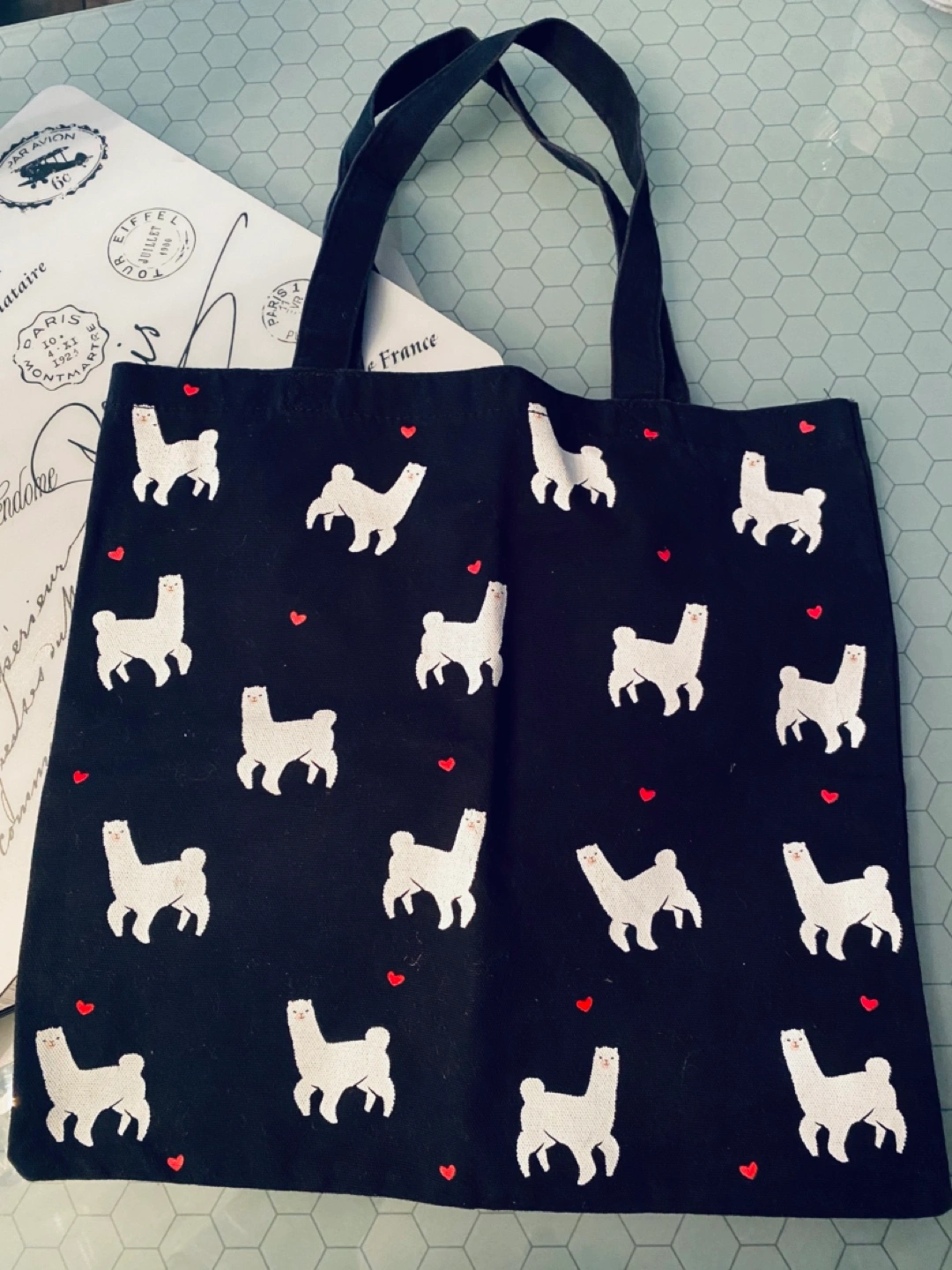 Black 100% cotton tote bag. Features a repeating pattern of adorable prancing white alpacas and floating red hearts. Machine washable, hang to dry. In excellent clean condition. #llama #alpaca #cute #kawaii #animals #bags