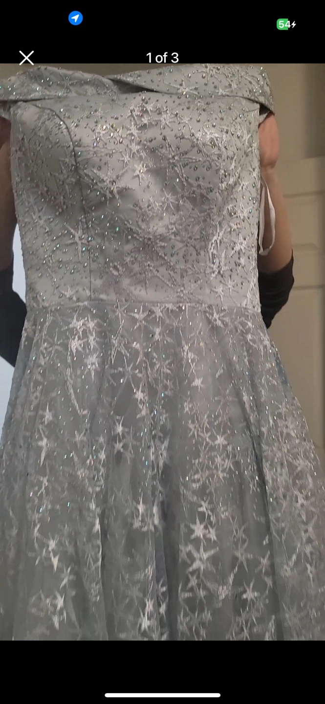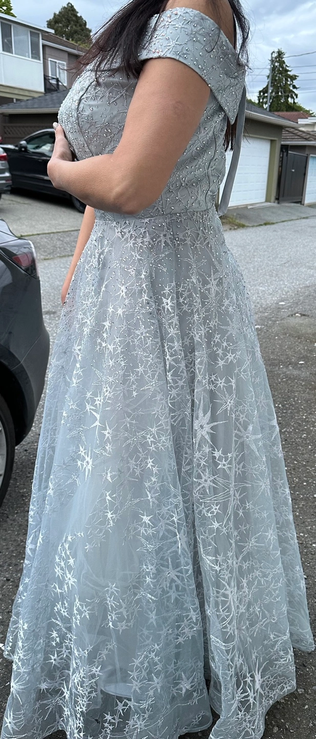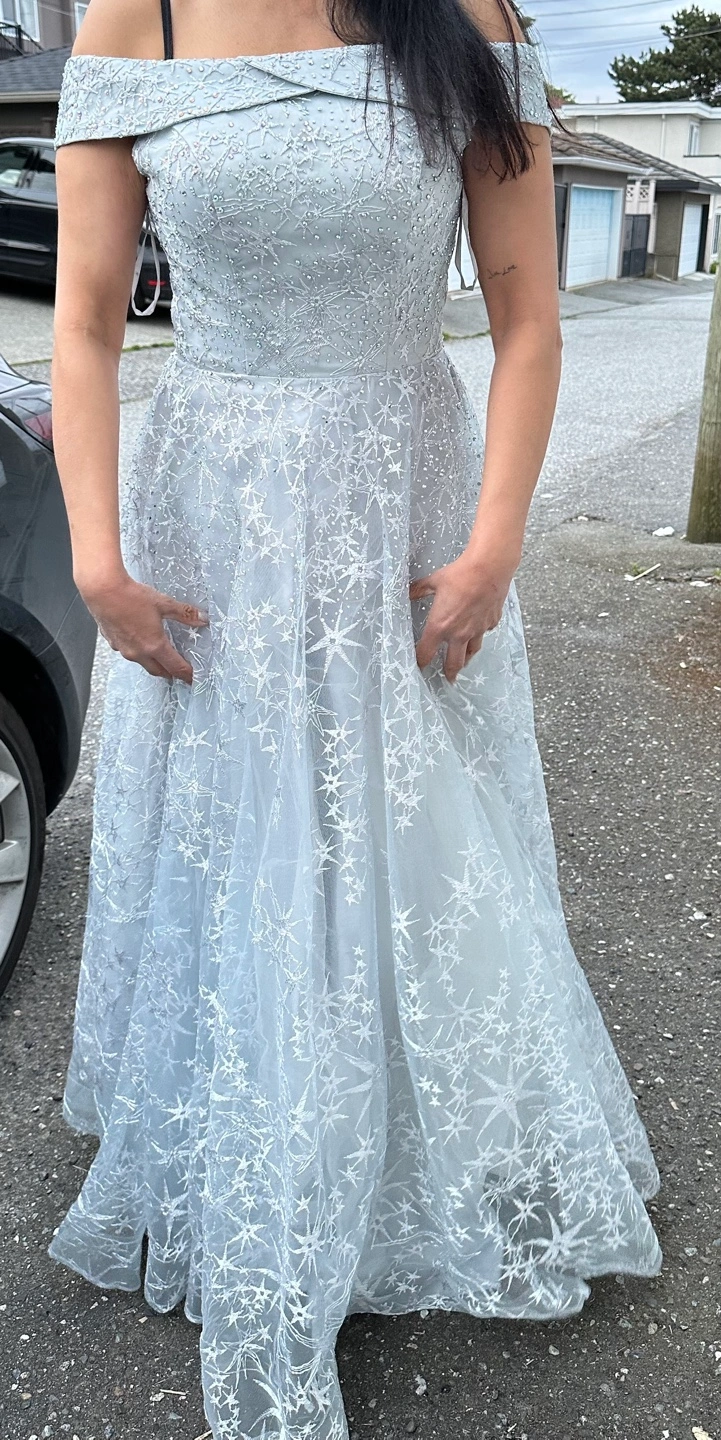 Beautiful off-the-shoulder gown. Floor-length, A-line silhouette. Features delicate star-shaped embroidery and subtle beading. Light grey tulle fabric. Perfect for prom, a special occasion, or other formal event. No damage, tears or wear.