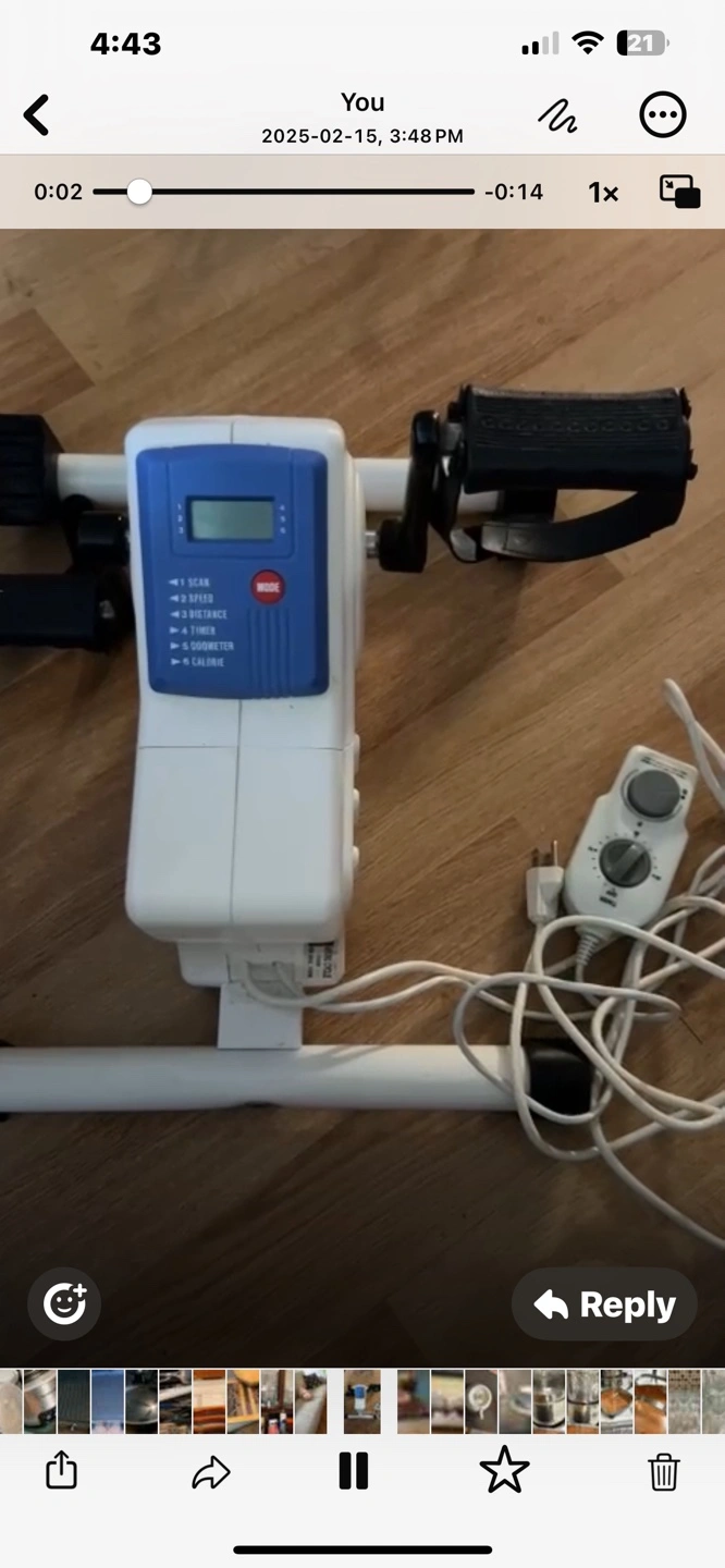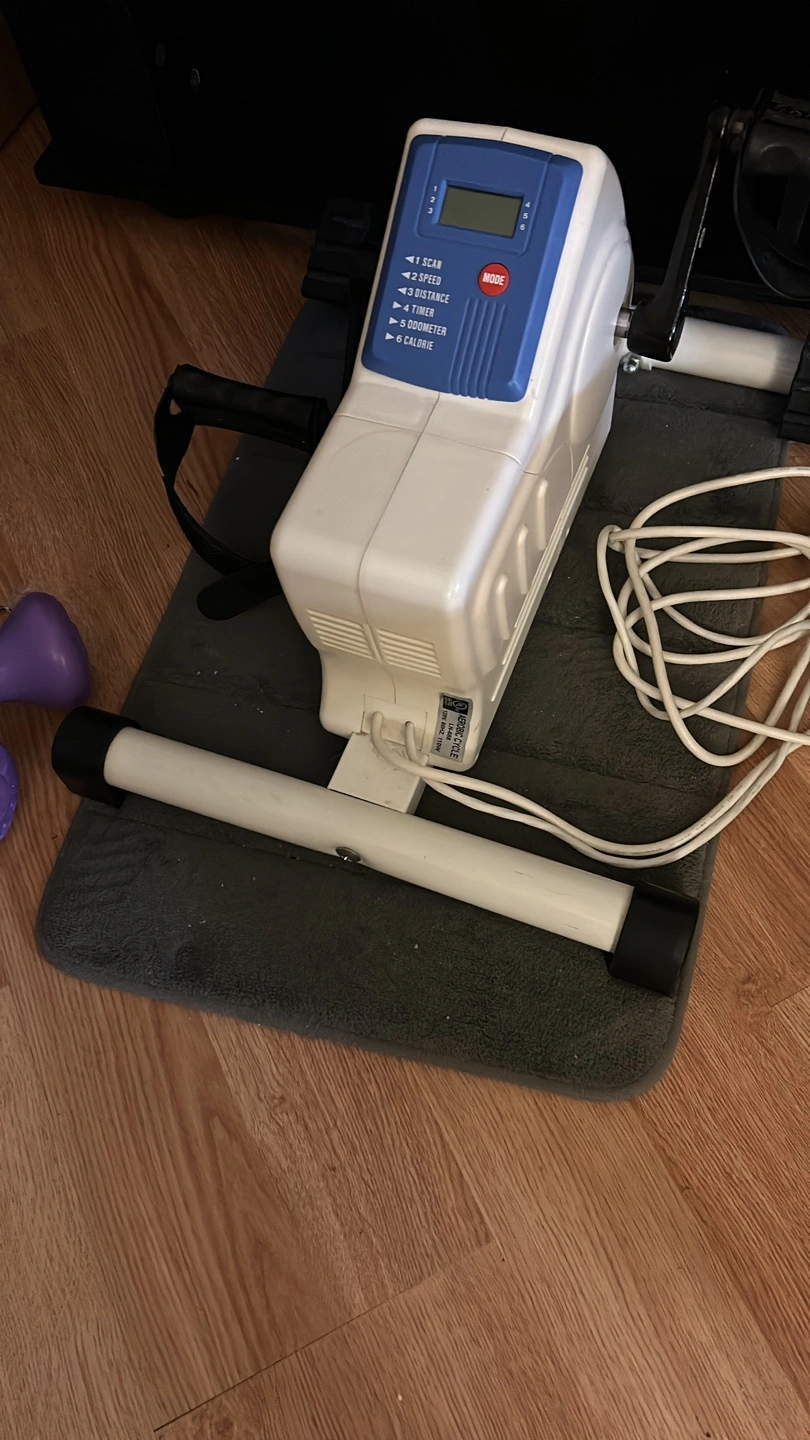 Portable cycle for exercise. Features digital display showing scan, speed, time, distance, and calories. Includes power cord and resistance control. Great for rehabilitation or home workouts.