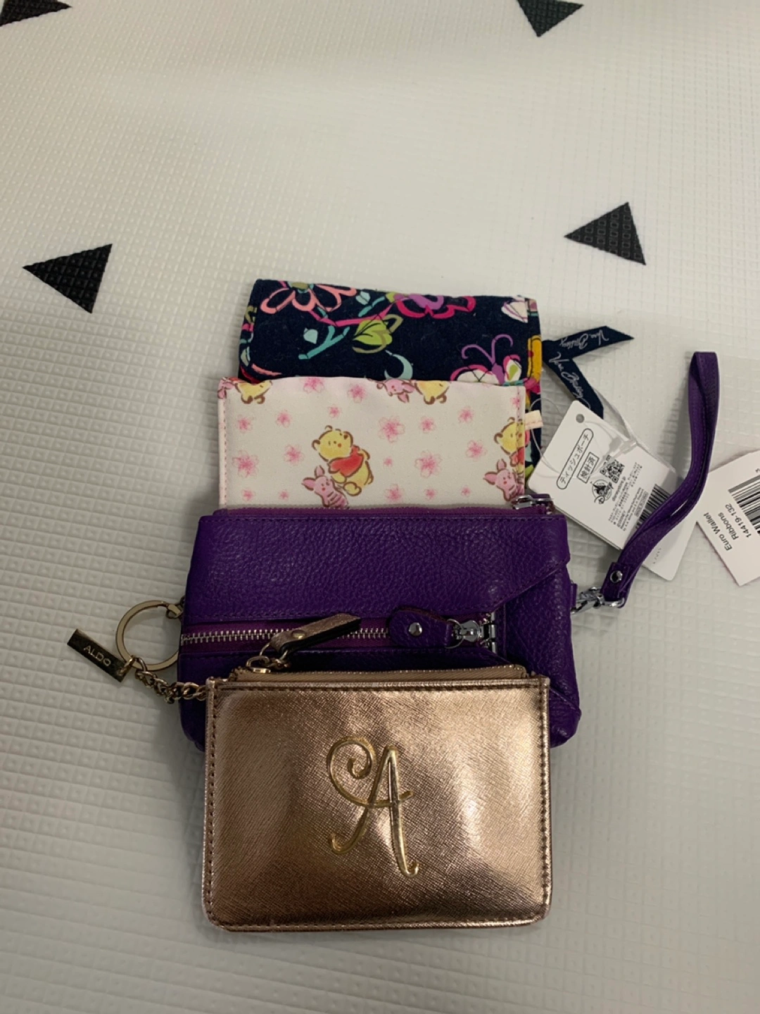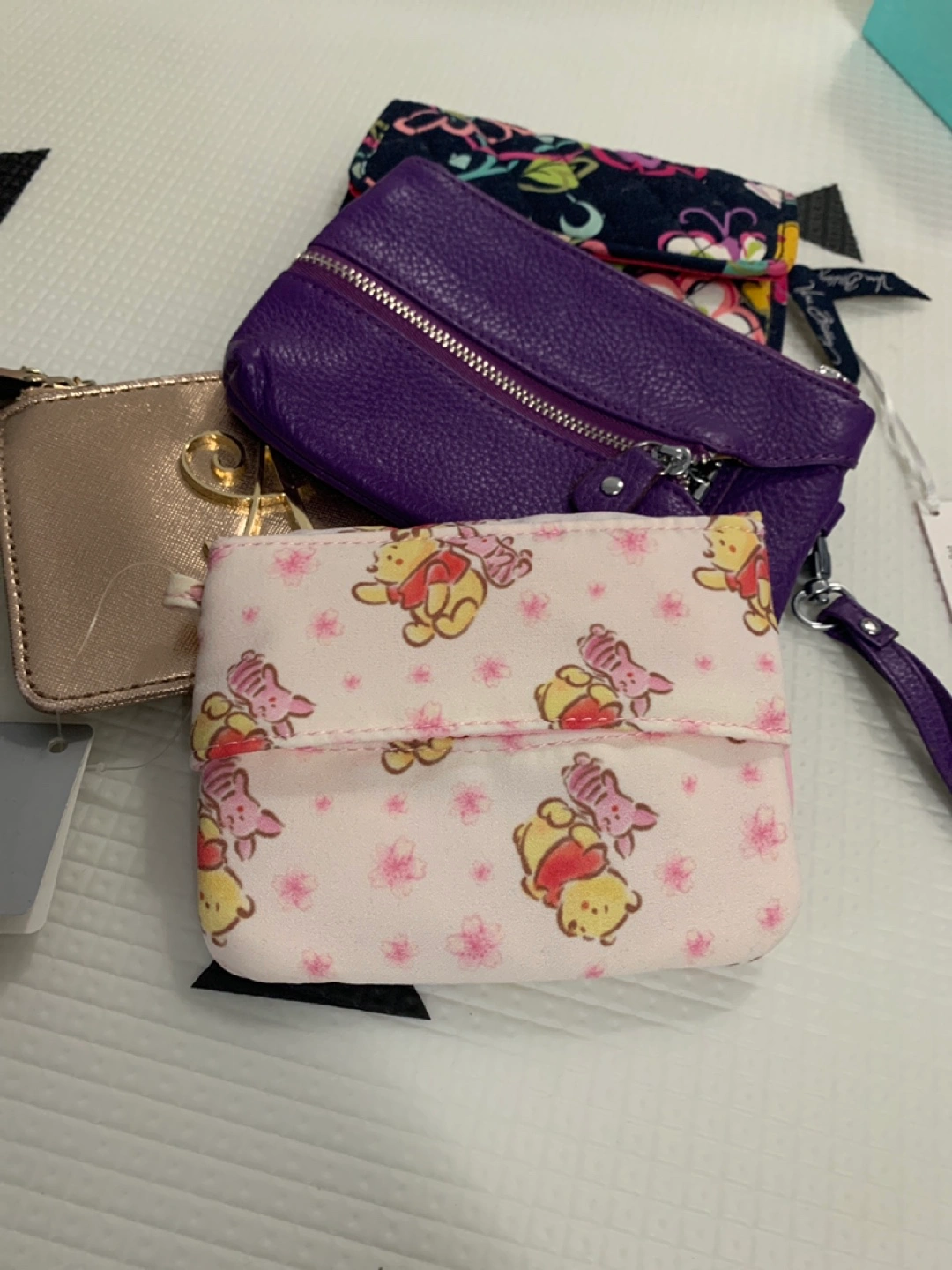 Four mini wallets. One purple leather zip-around wristlet. One gold metallic with monogram. Two fabric wallets; one Winnie the Pooh design, one floral print. Perfect for cards and small essentials.