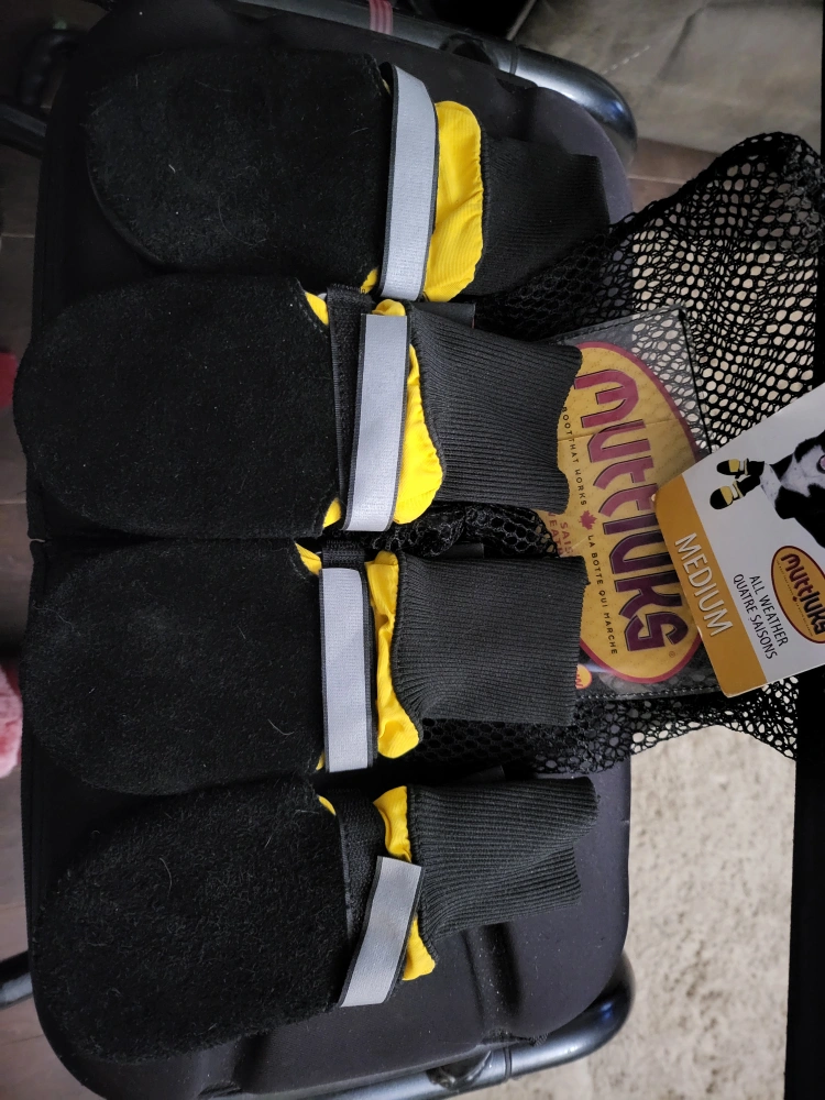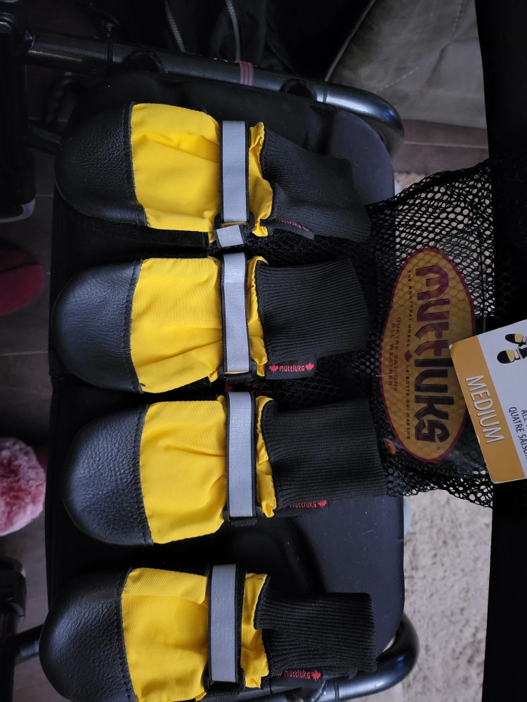 New Four Mutluks dog boots. Two sets, one red and one yellow. Size medium. Fleece lined. Includes mesh carrying bag. 35.00 each set 401 and islington ave