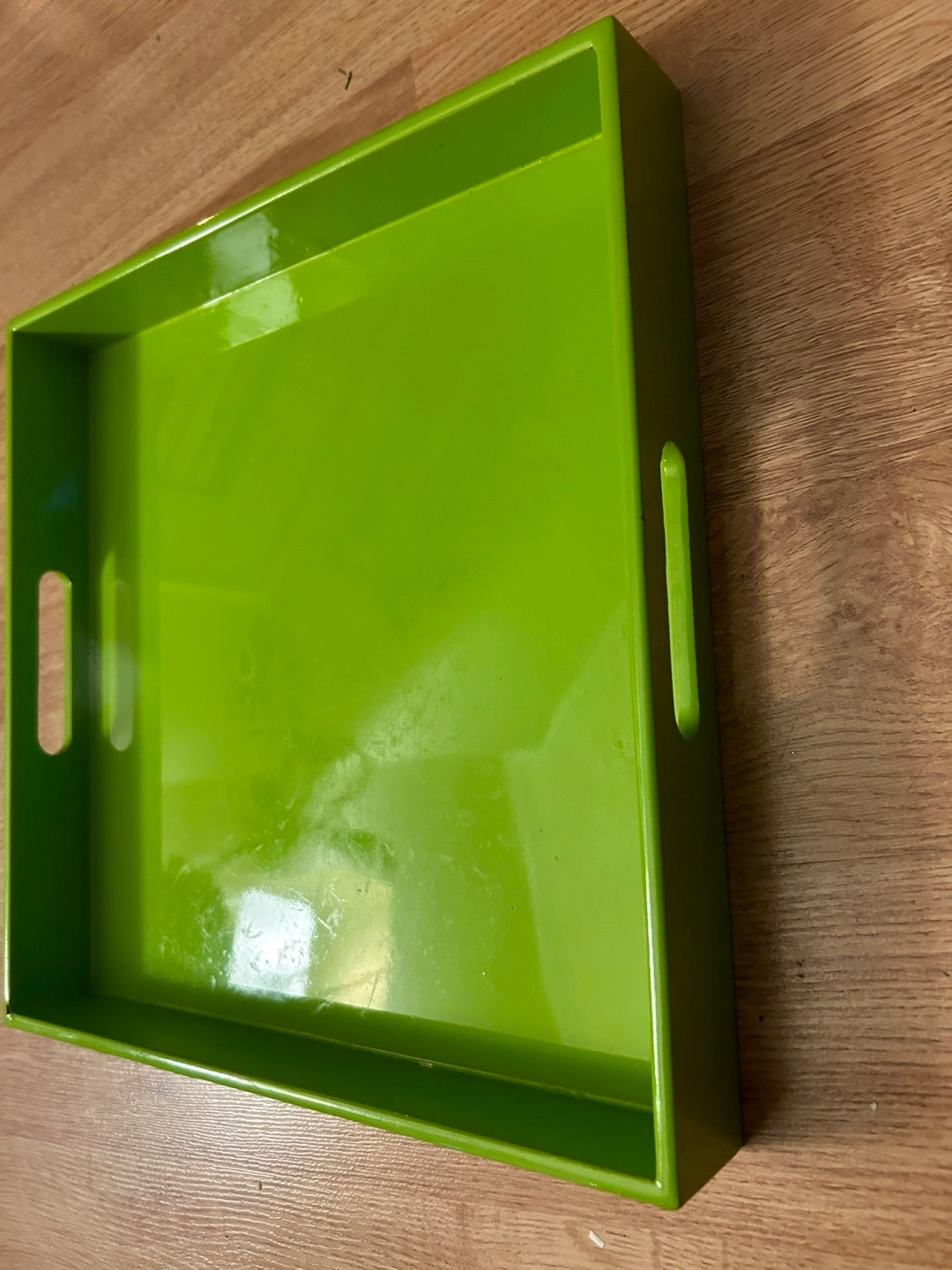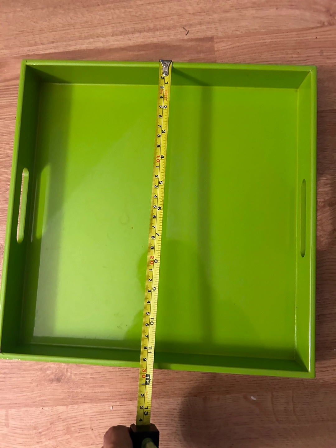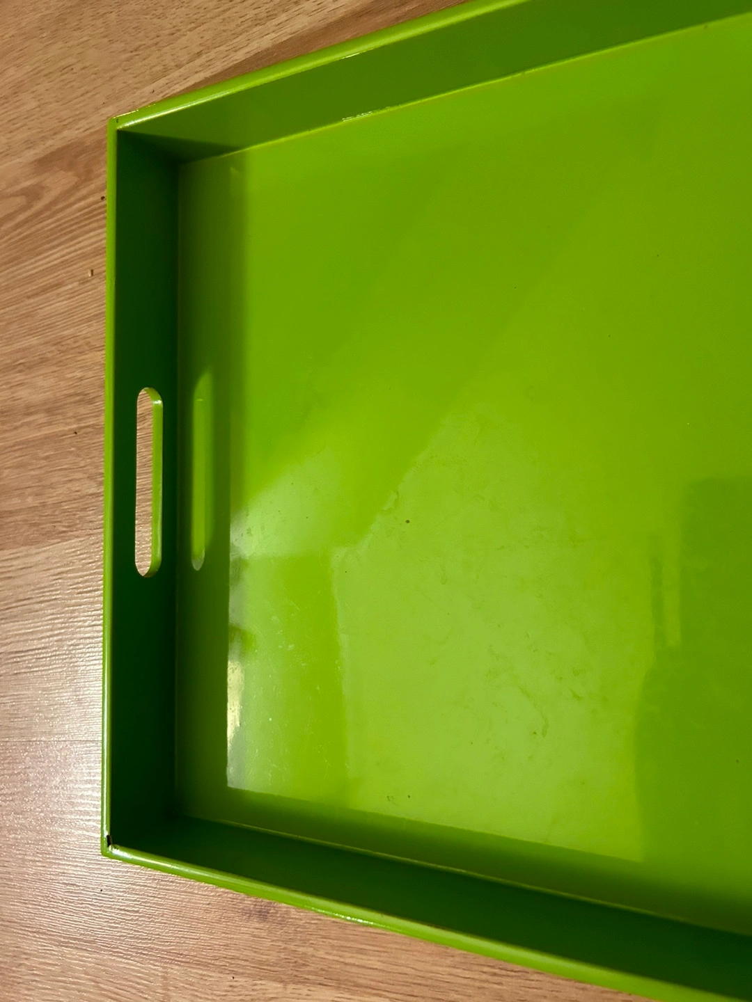 Large rectangular tray. Bright lime green colour. Features two cut-out handles on either side. Measures approximately 13" x 18". Perfect for serving or organization.