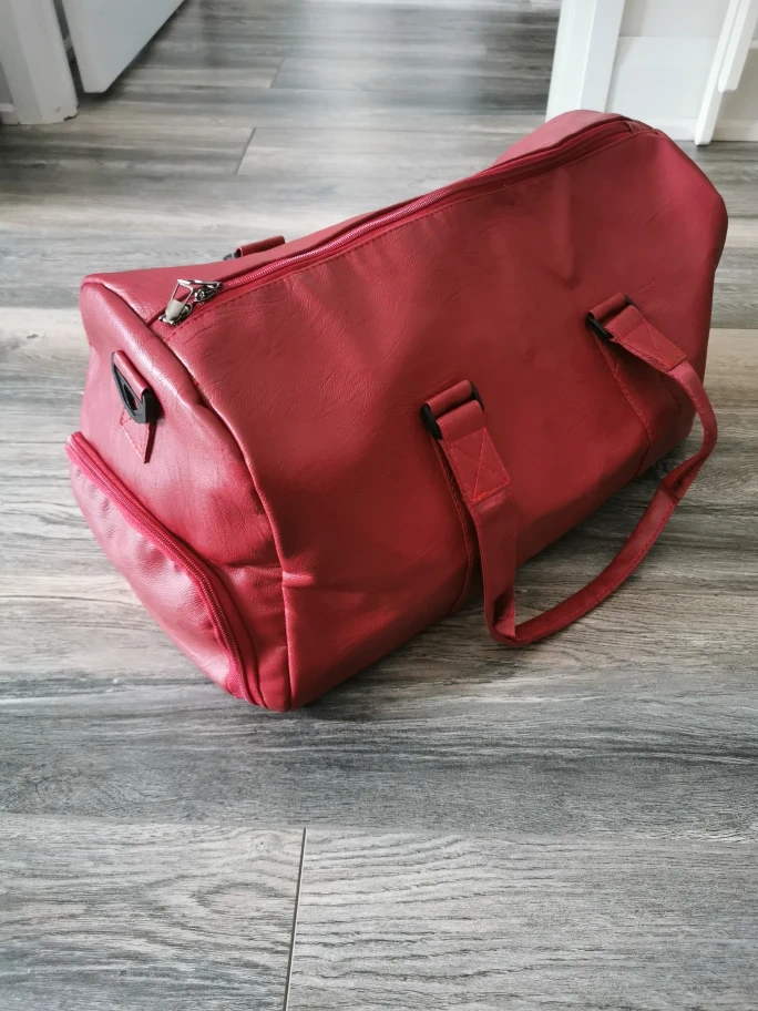This is synthetic leather. Large burgundy duffel bag. Features zipper closure, two small inner pockets, and a detachable shoulder strap. Durable and stylish. Size : W19 x D10 x H 11 (inc) NO pet, smoke home
