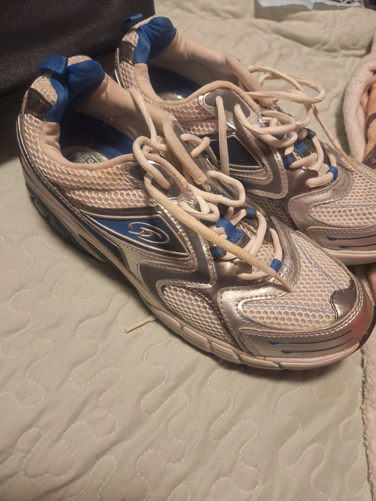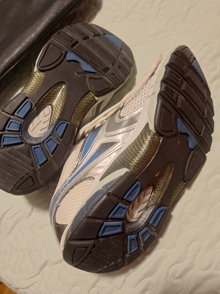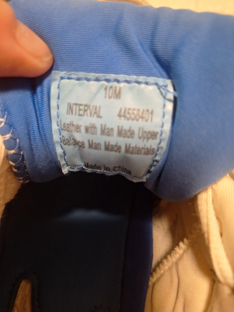 Men's running shoes, size 10M. Silver, white, and blue colour scheme. Leather and man-made materials. Made in China.