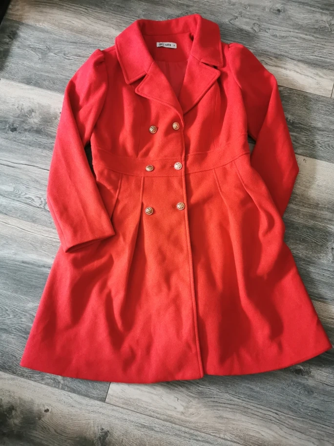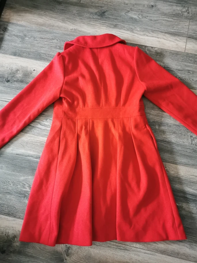 Women's red peacoat. Double breasted, gold buttons. Medium size. 98% polyester, 2% viscose. There are both side pockets. NO pet, smoke home