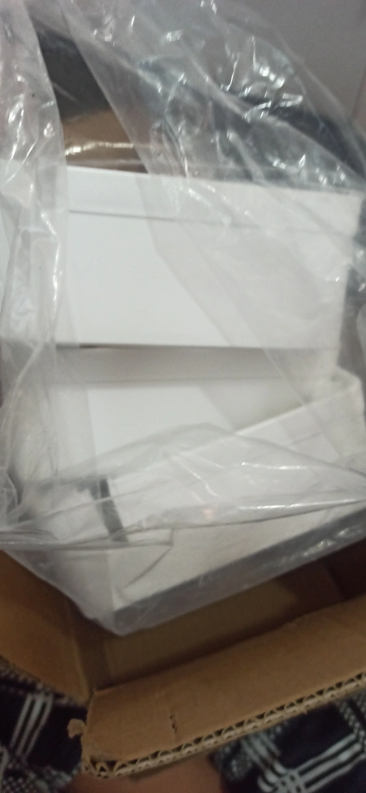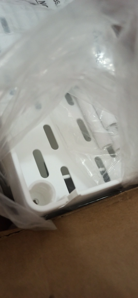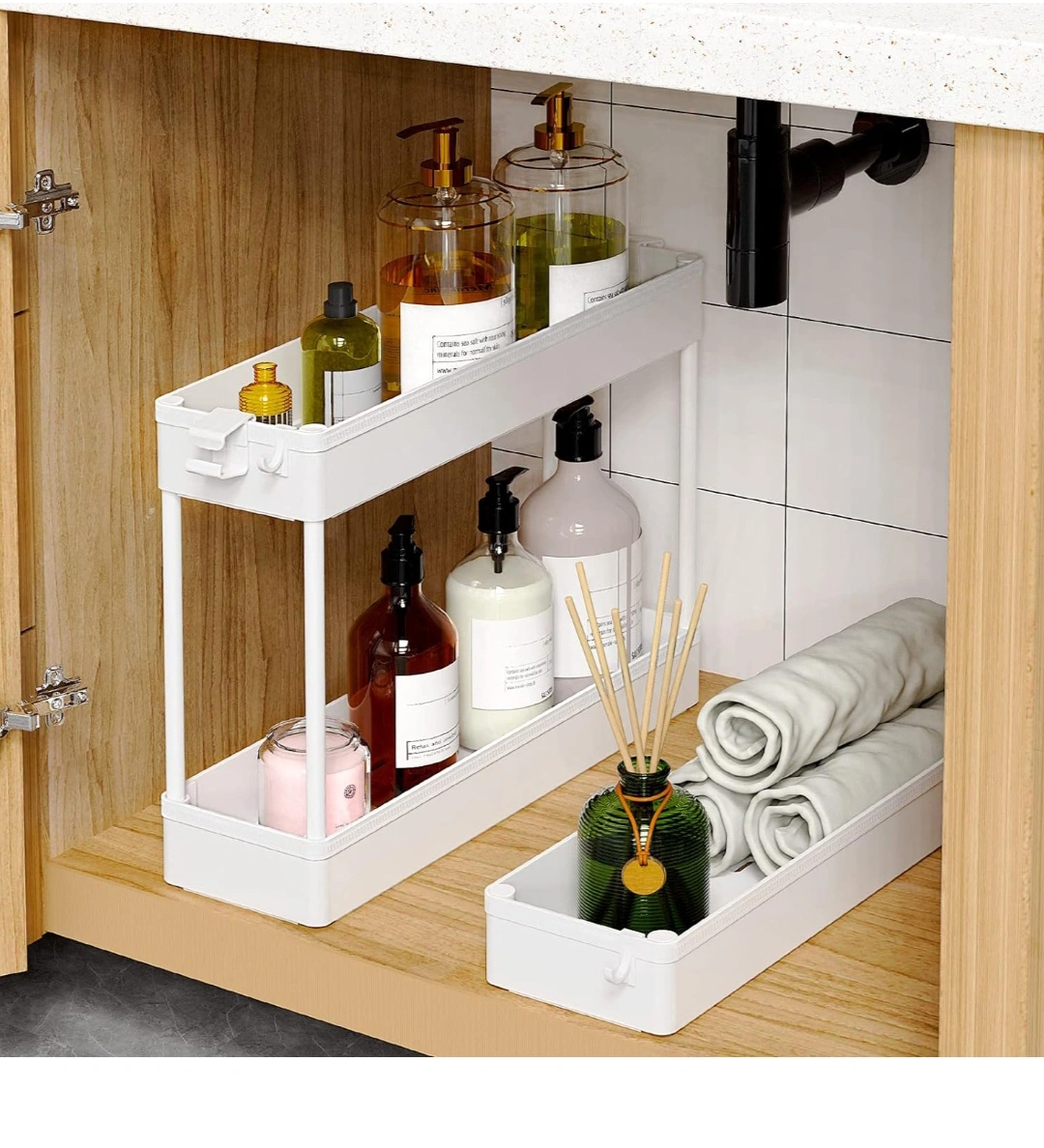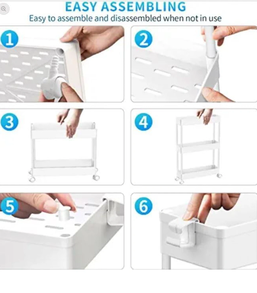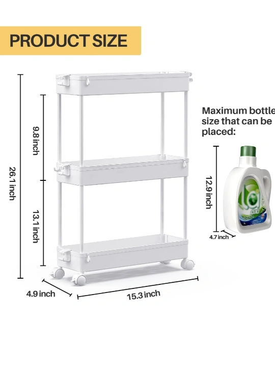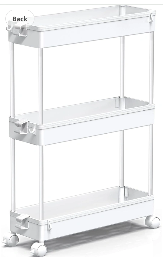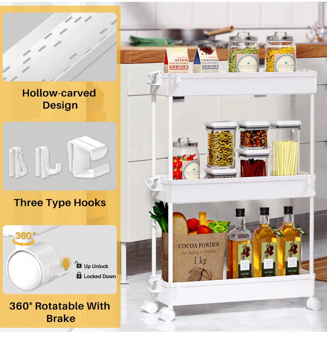 White plastic storage cart. Three shelves, 360-degree rotatable wheels with brakes. Includes hooks. Ideal for kitchen, bathroom, or pantry organization.