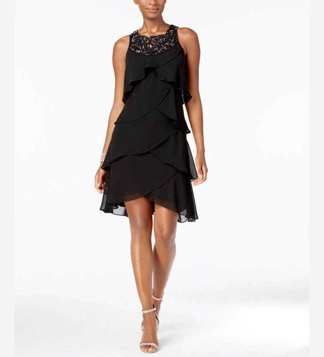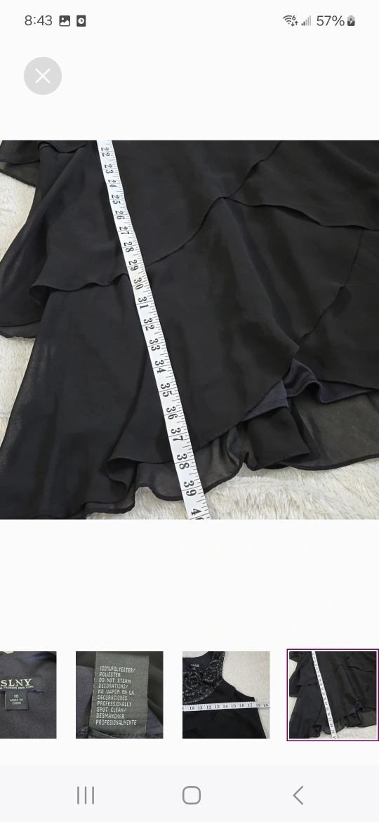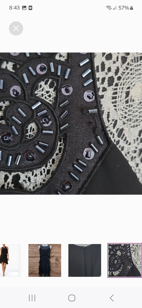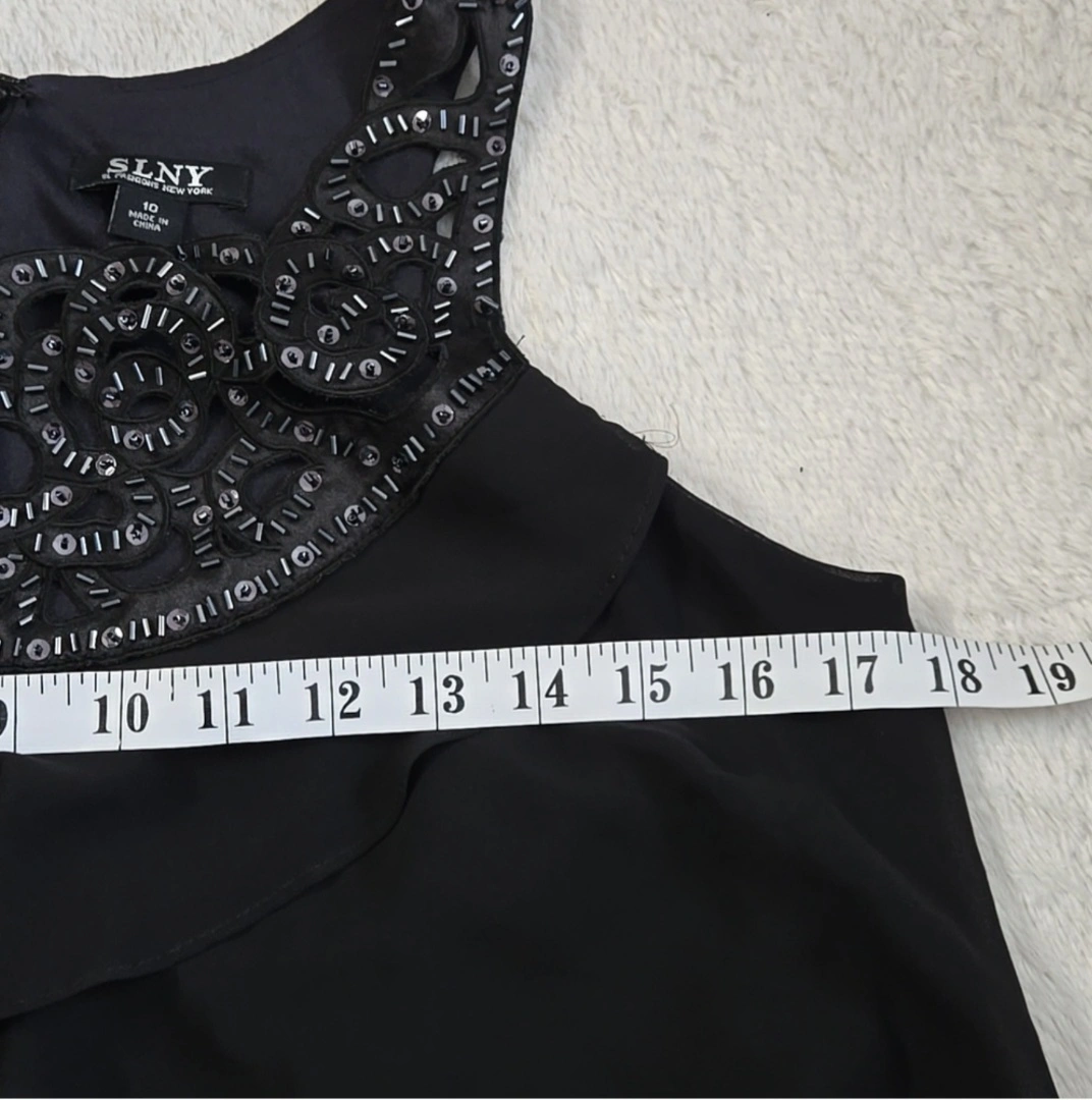 Stunning black cocktail dress. Size 10. Features layered ruffles and a beautiful beaded neckline. 100% polyester. Spot clean only. After thorough inspection only 1 bead is missing (as seen on the photo) other than that no rips, holes or stains. Overall it is good condition. Perfect for any occasions Location Barrhaven area close to Home Depot Cash on pick up or etransfer few minutes prior to pick up NO by the door transfers please Can arrange delivery through Trexity service their fees and taxes applies