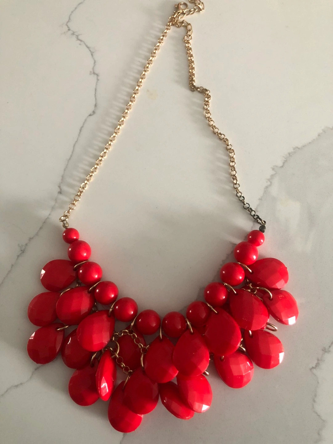 Gorgeous red statement necklace with matching earrings. Features red beads and gold chain. Perfect for adding a pop of colour to any outfit. Free. Pick up in Pickering (Altona & Kingston).