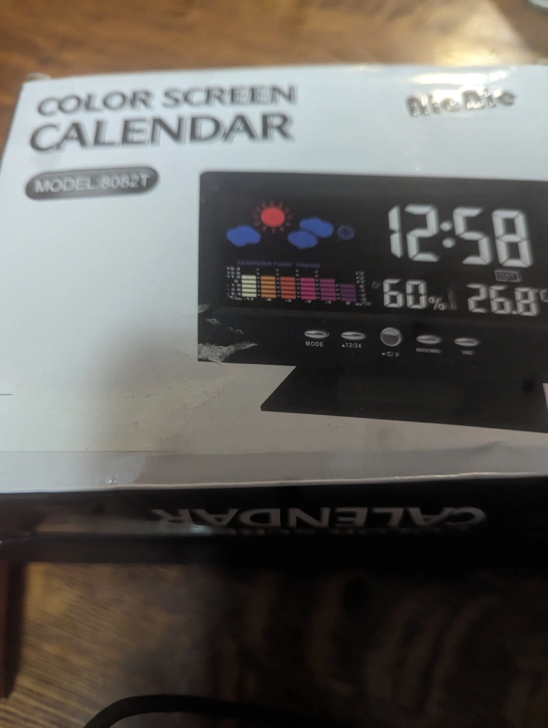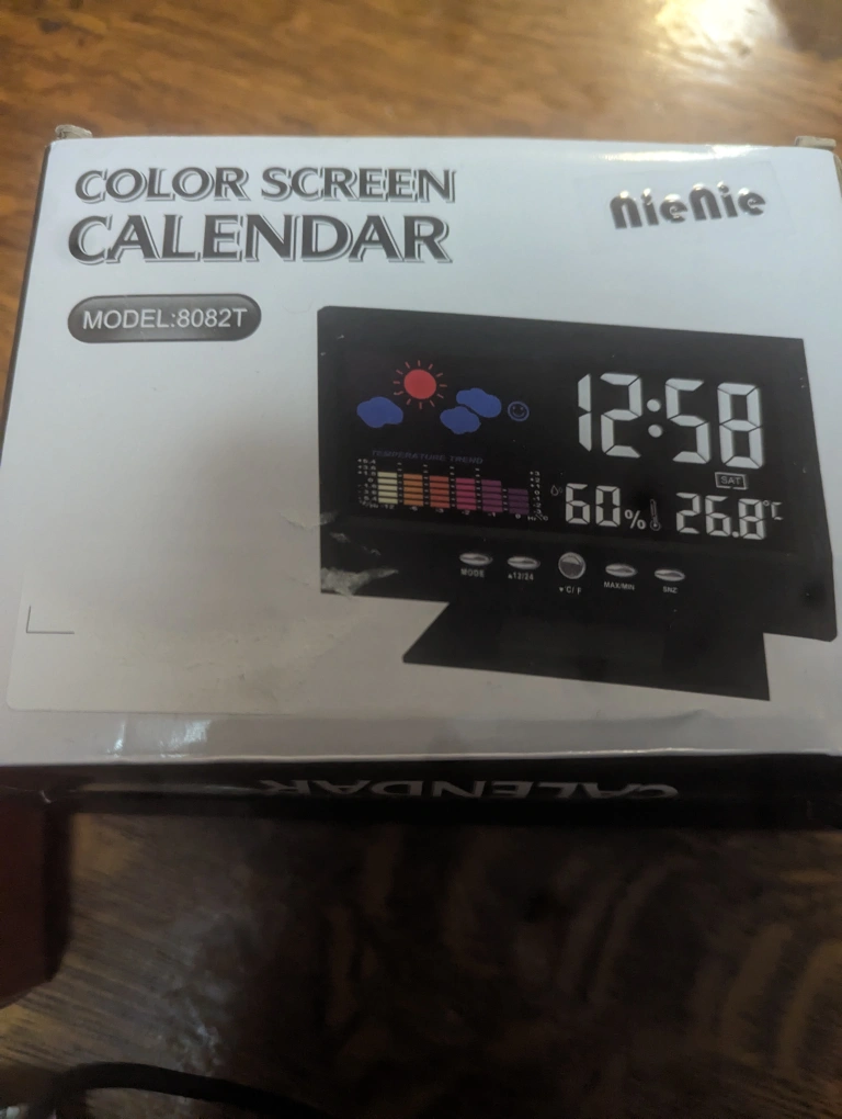 Colour screen clock in black, with temputater, humidity , time, date weather, humidity, and calendar feactures with stand. Voice display. Background colour display. Comes with USB port to charge. User manual. In original brand new unopened box. I have one of these as well. They are great, for time, date, temperature needs. The back display light brightens your dresser drawer or where displayed. Great price π $ 10