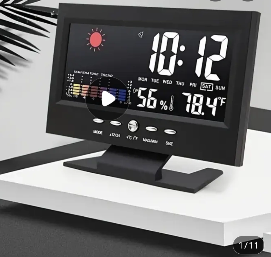 From Nie Nie ( Colour Black ). Voice control. Displays : Humility,, Temperature .Date, Tim,e, Weather, , Calender Feactures. Background light display. Comes with USB port to charge. User manual included. In original unused new box. I have one of these as well. it is great, everything you could want , need in a time date, temperature, humidity clock. Back ground light display is cool, brightens any side dresser drawer! Great price too.π