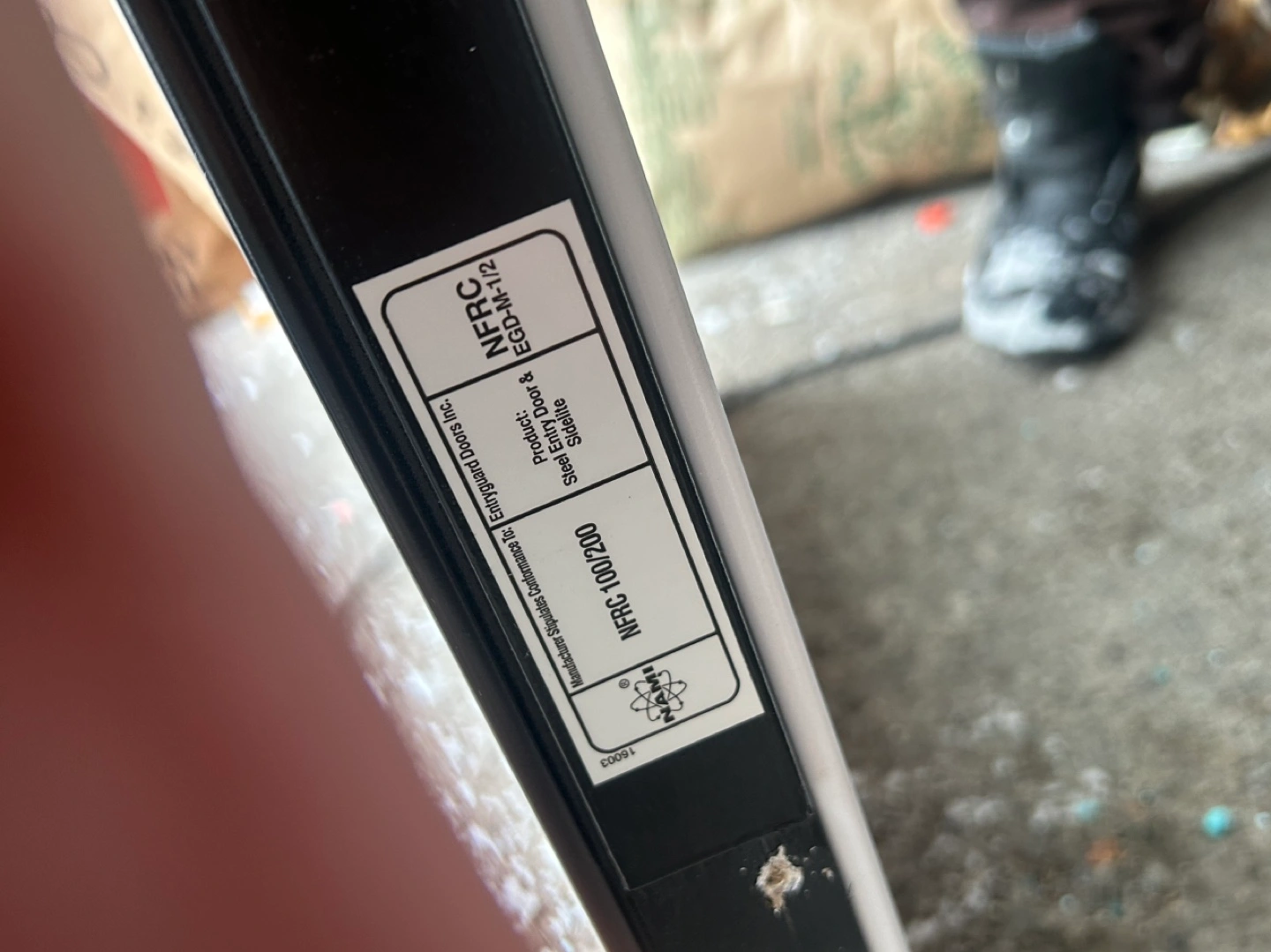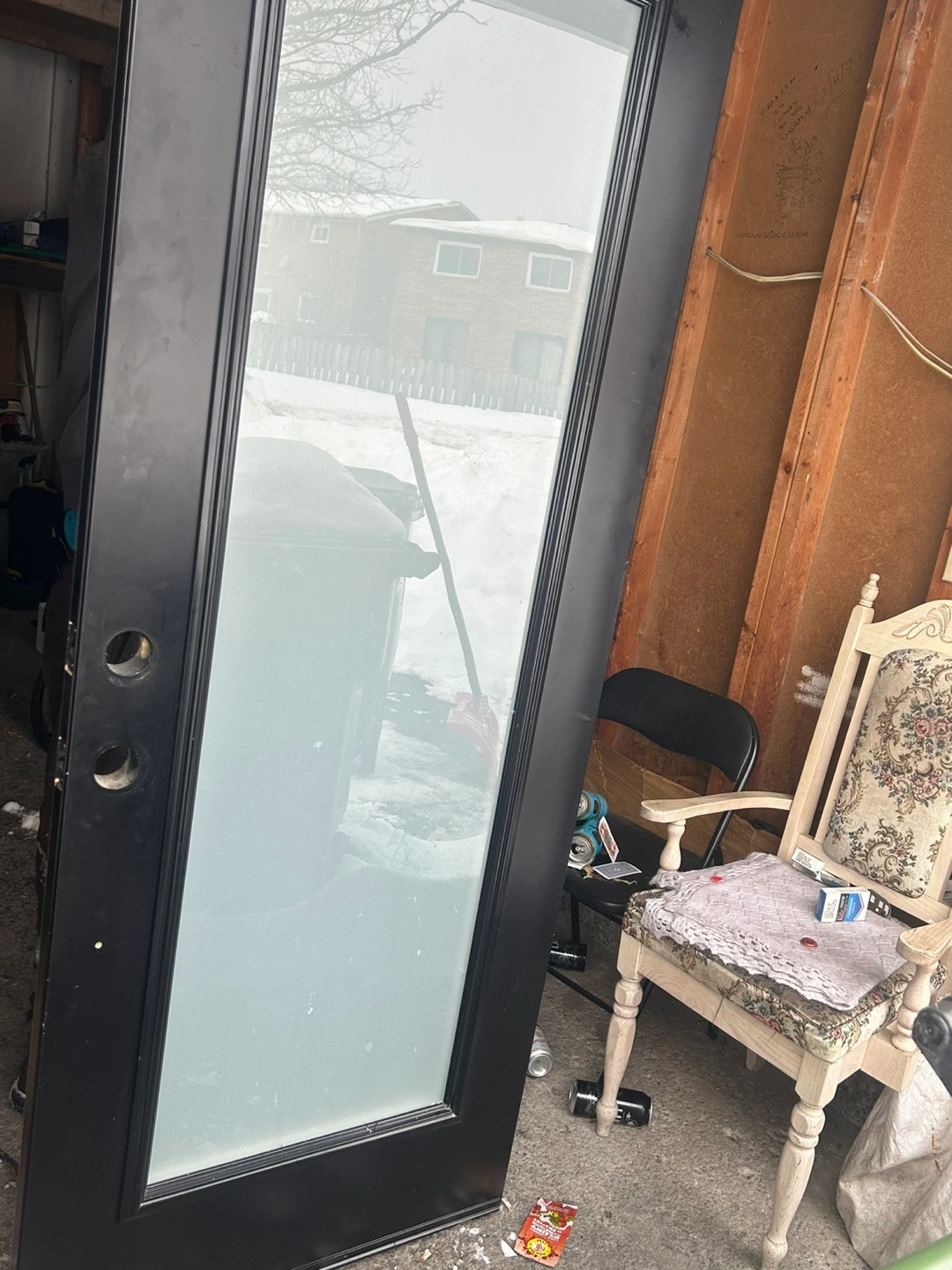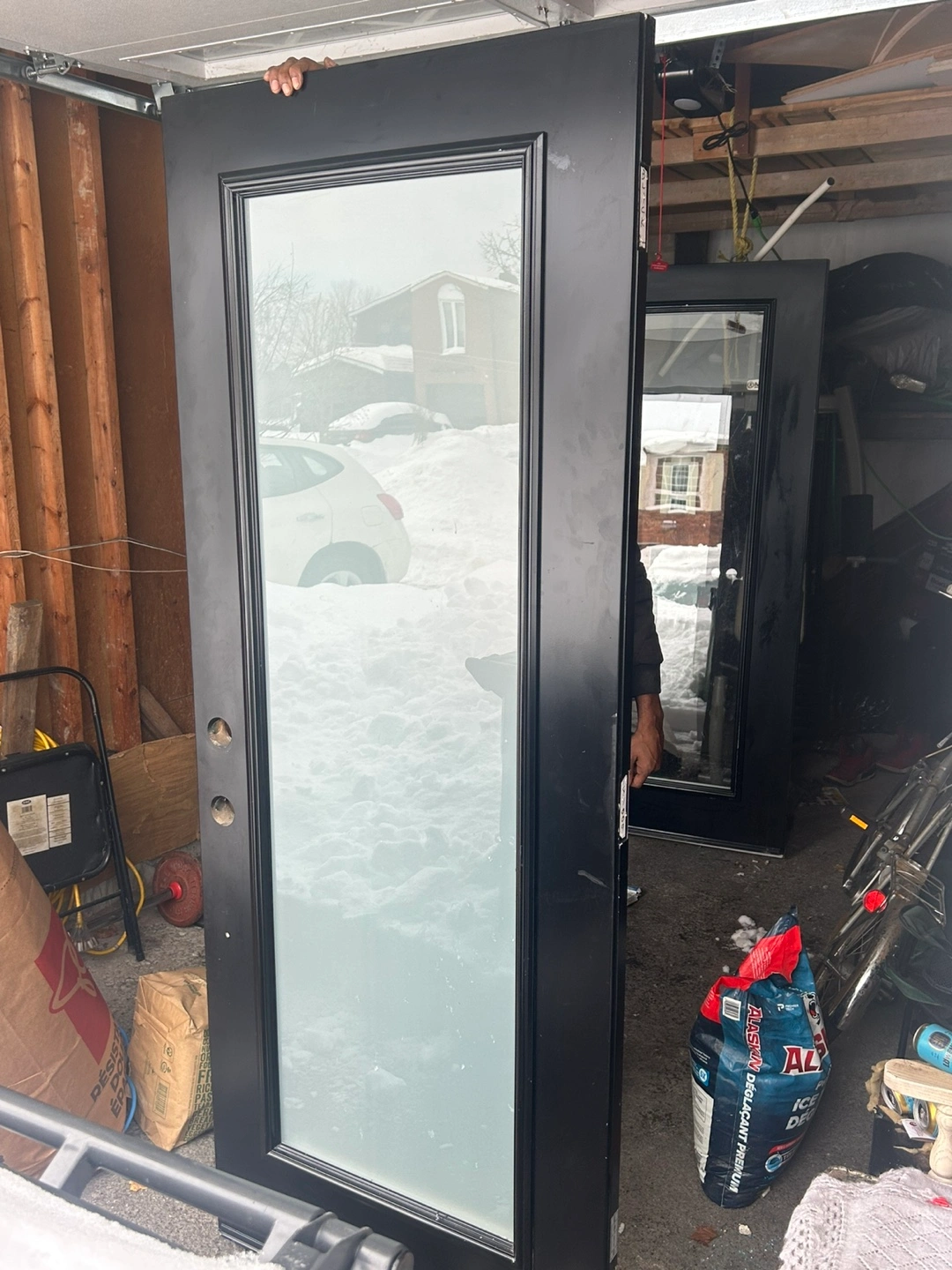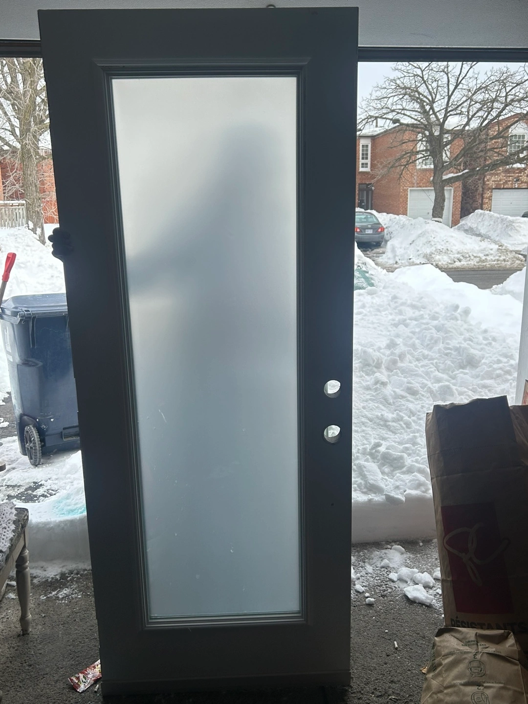 Exterior door, frosted glass panel, black frame. Includes door , Model number NFRC 100/200. Size: 31.5 inches wide X 78 inches height