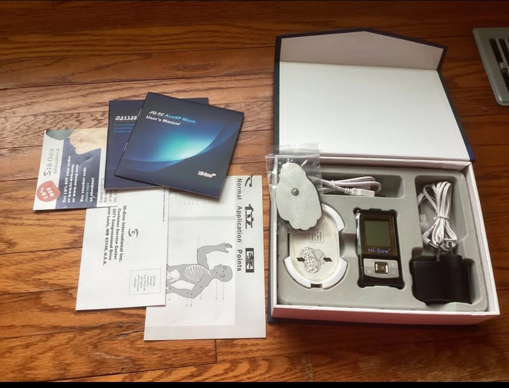 Brand New In Box Hidow AcuXP micro TENS (transcutaneous electrical nerve stimulation)and EMS (electronic muscle stimulation) machine. Includes -unit - 1 set large single sided adhesive electrode pads 2.5 inches (hand shaped) - 1 set small single sided adhesive electrode pads 1.25 inches ( oval shaped) - 2 electrode wires - USB extension wire - AC/DC adapter - User manual - Pads sticking board - Pad placement chart The unit features a large easy to read LCD display, adjustable timer, 6 modes, double outputs, rechargeable lithium battery, 20 strength level settings.