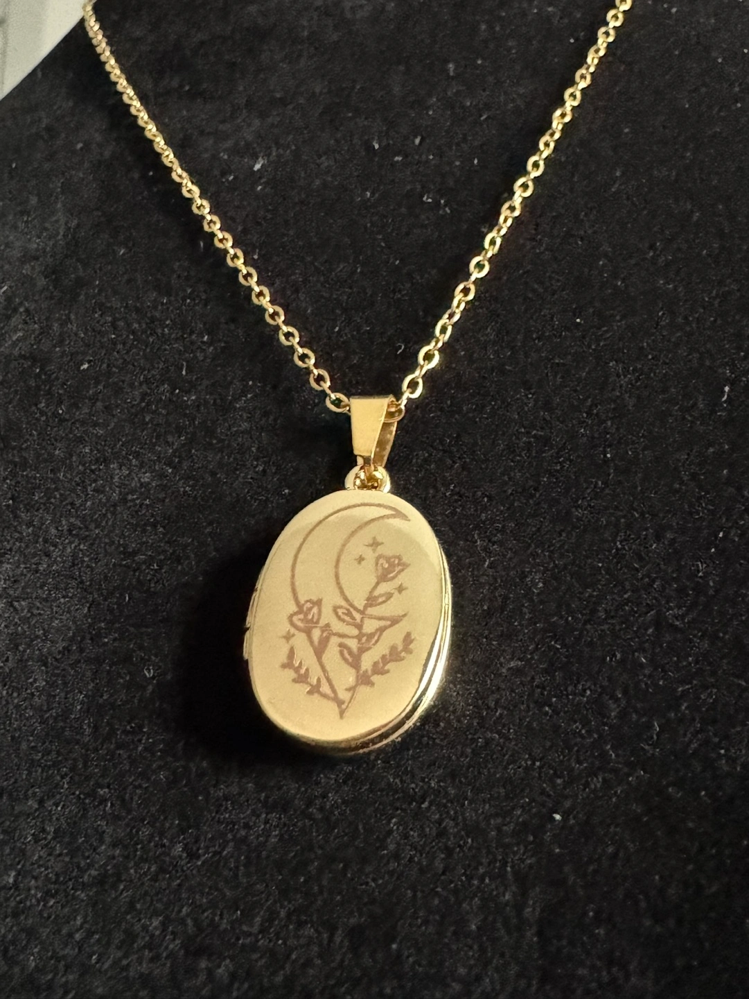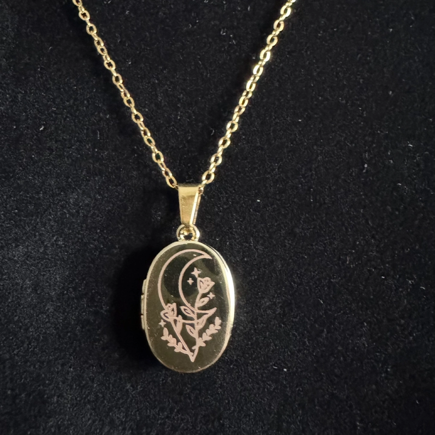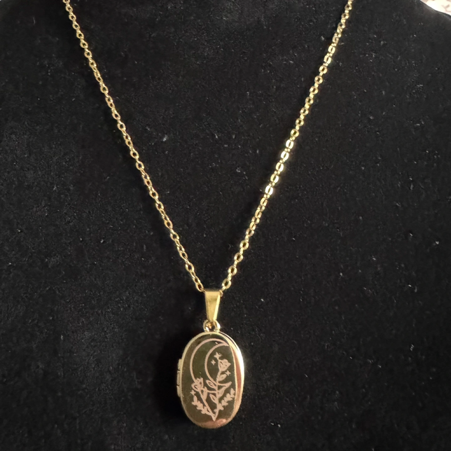 Gorgeous gold tone locket necklace. Features an engraved moon and flowers design. Oval-shaped locket opens to reveal two compartments. Includes a delicate gold chain. Brand new and unused. Material: Gold Plated Stainless Steel