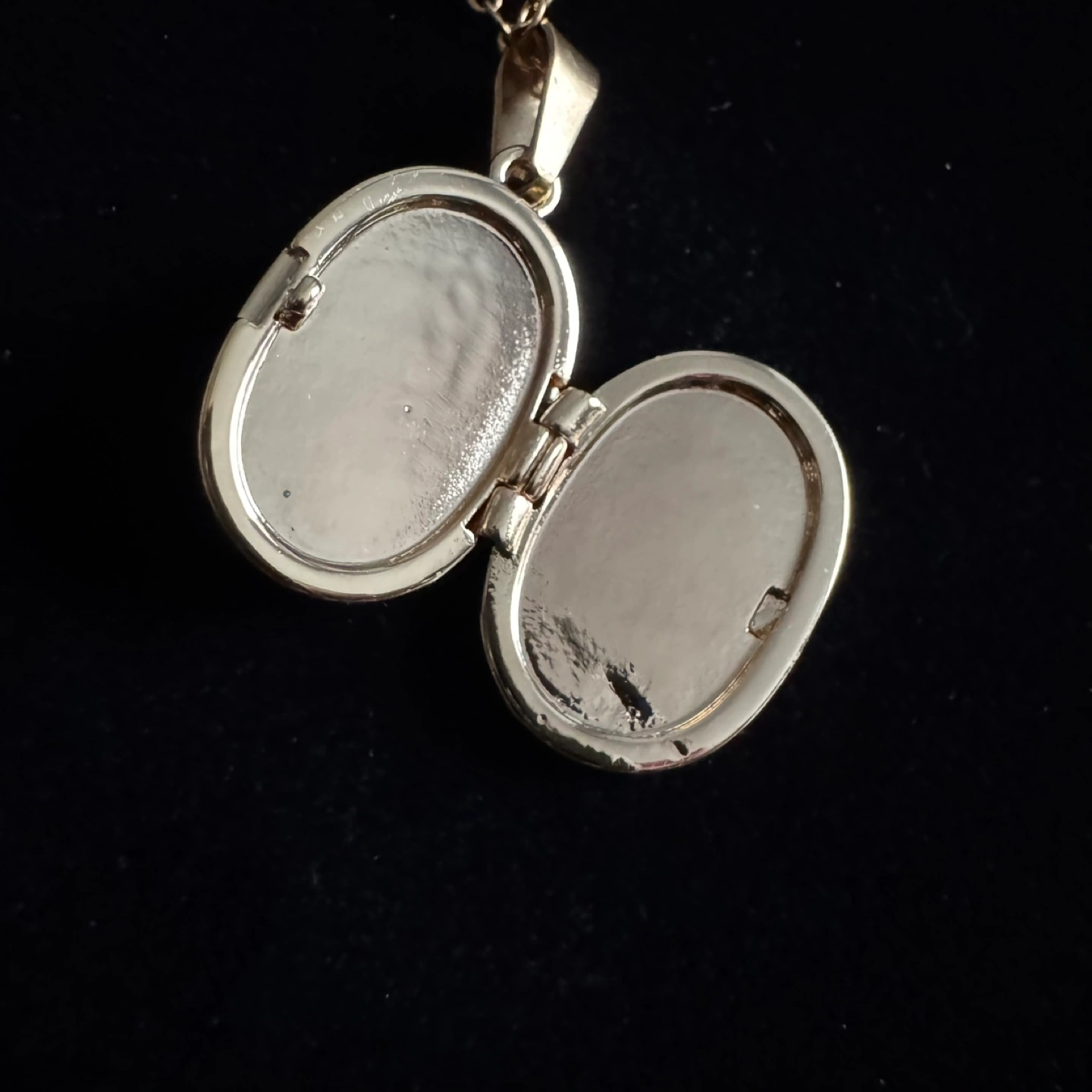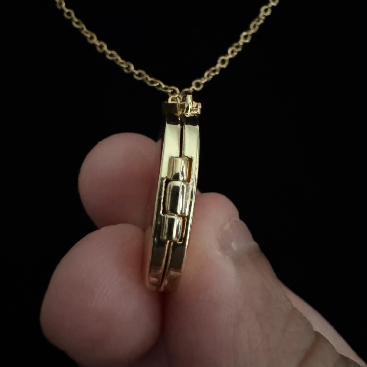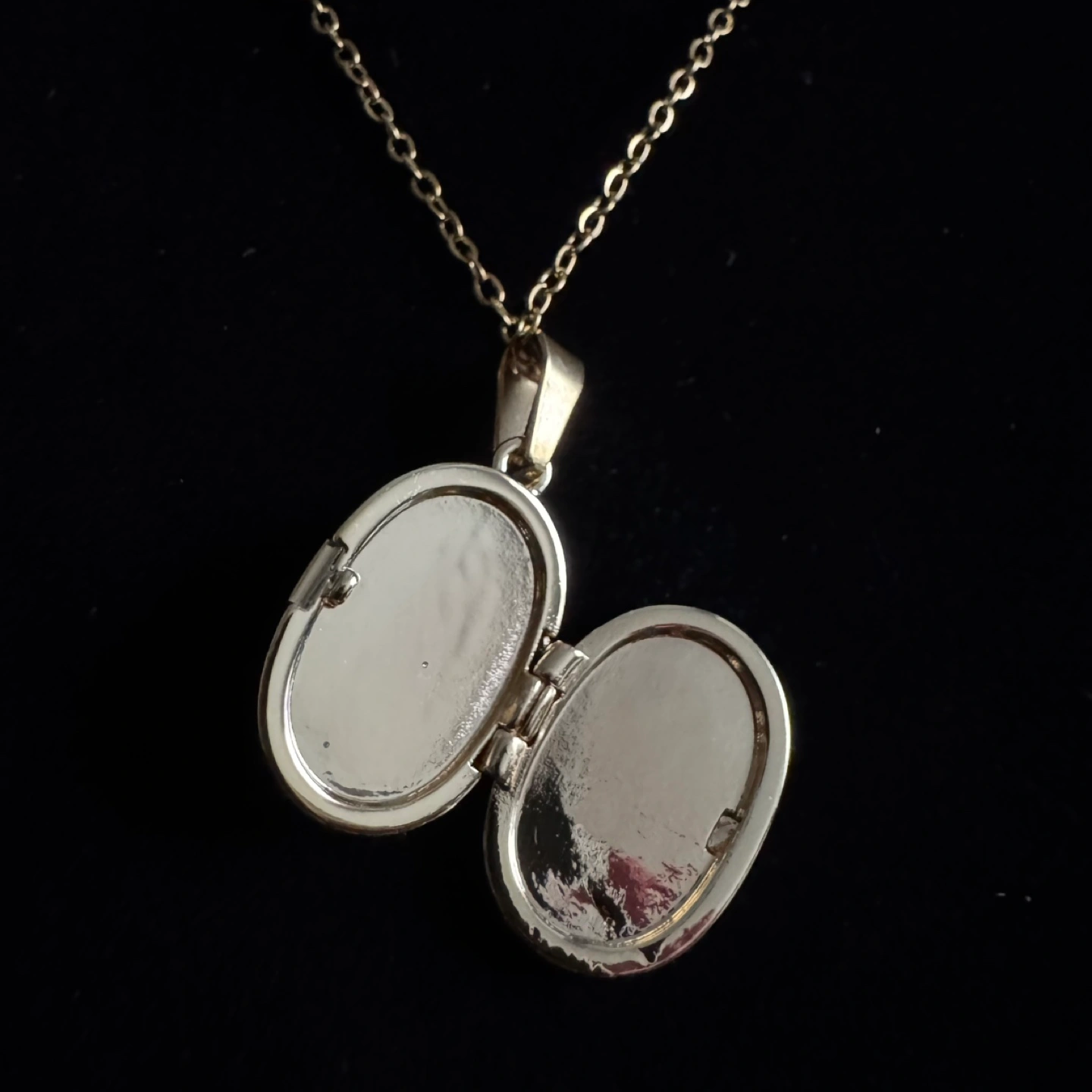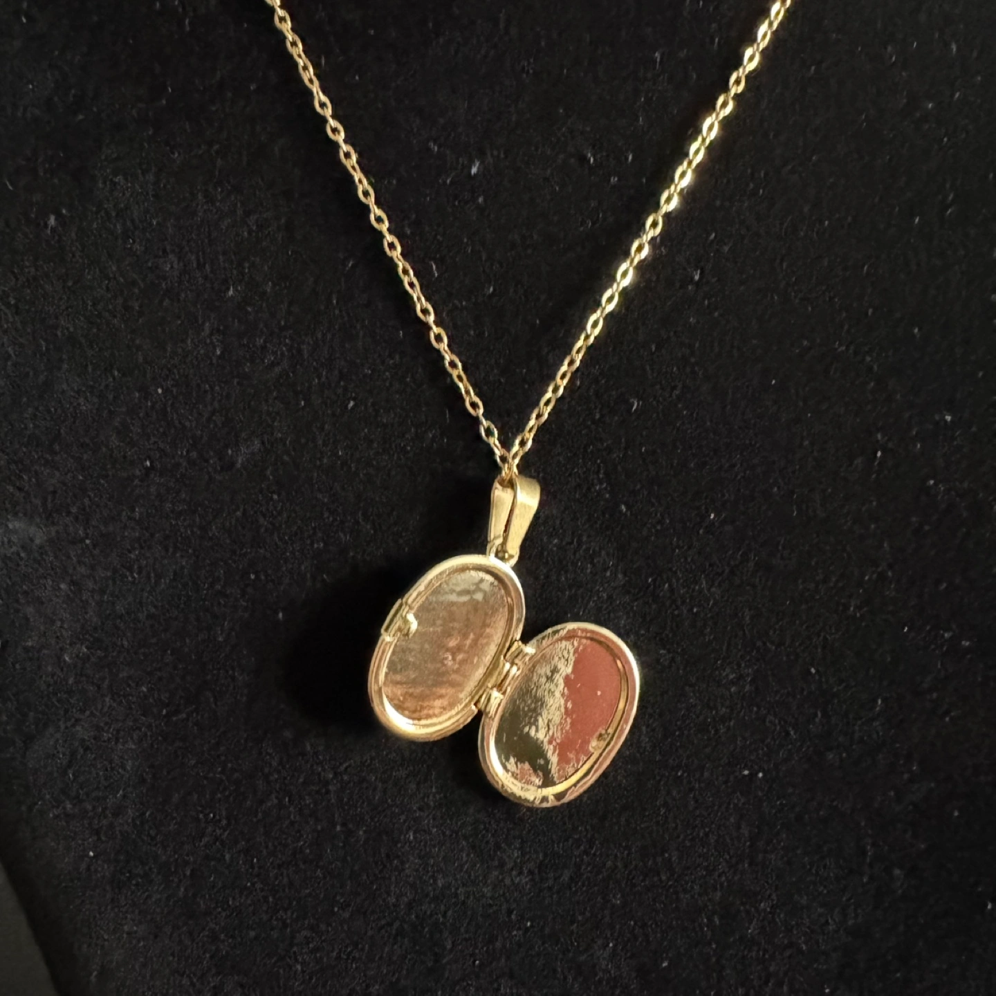 Gorgeous gold tone locket necklace. Features an engraved moon and flowers design. Oval-shaped locket opens to reveal two compartments. Includes a delicate gold chain. Brand new and unused. Material: Gold Plated Stainless Steel
