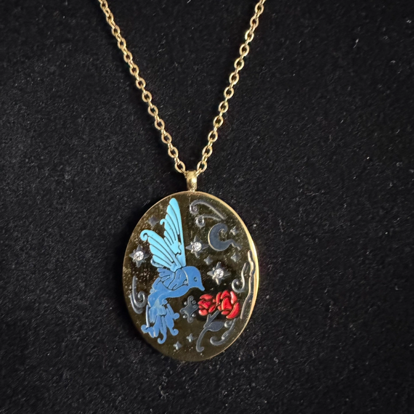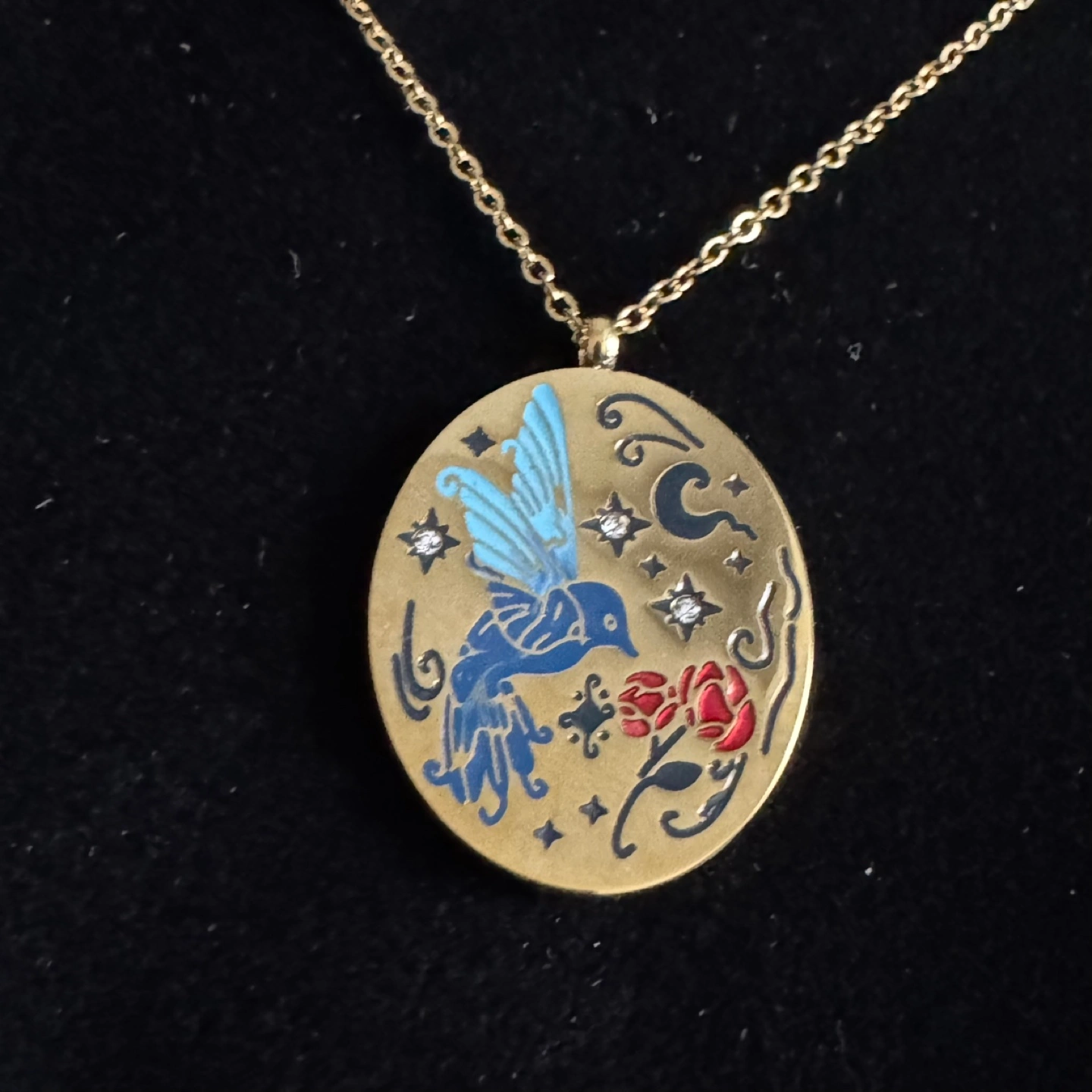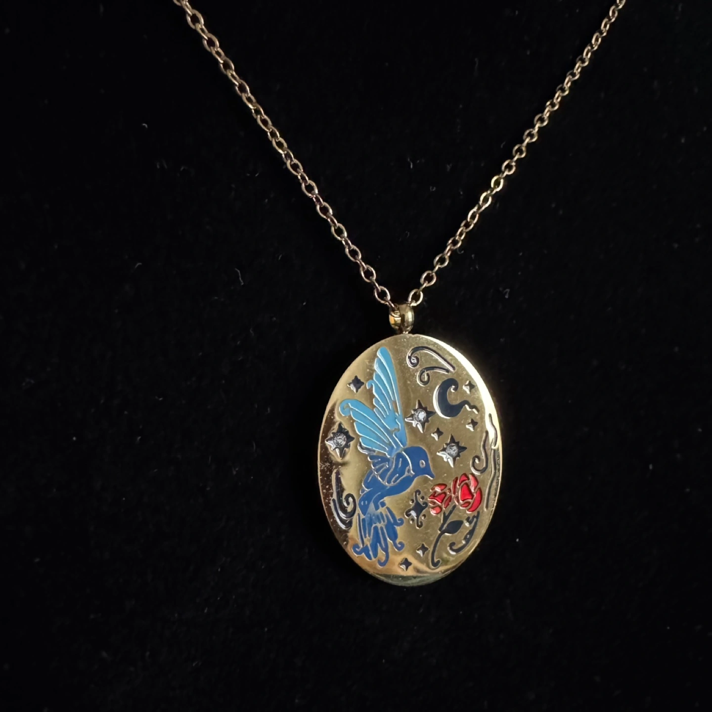 Beautiful gold-toned necklace. Features an oval pendant with enamel detailing. Depicts a blue bird, red rose, and stars. Delicate gold chain included. Gorgeous fairycore/cottagecore vibes. Item is in brand new/ununsed condition and stored in a smoke free and pet free environment. Material: Plated stainless steel and enamel