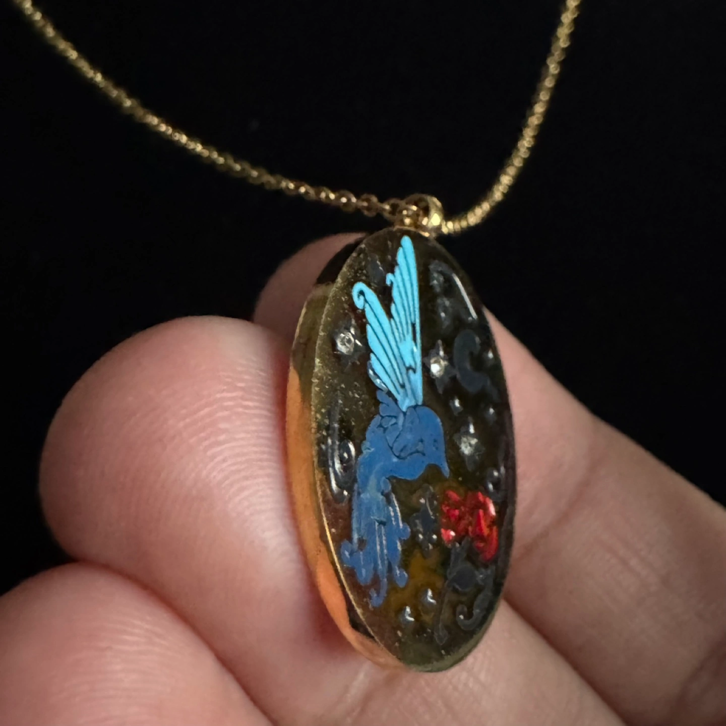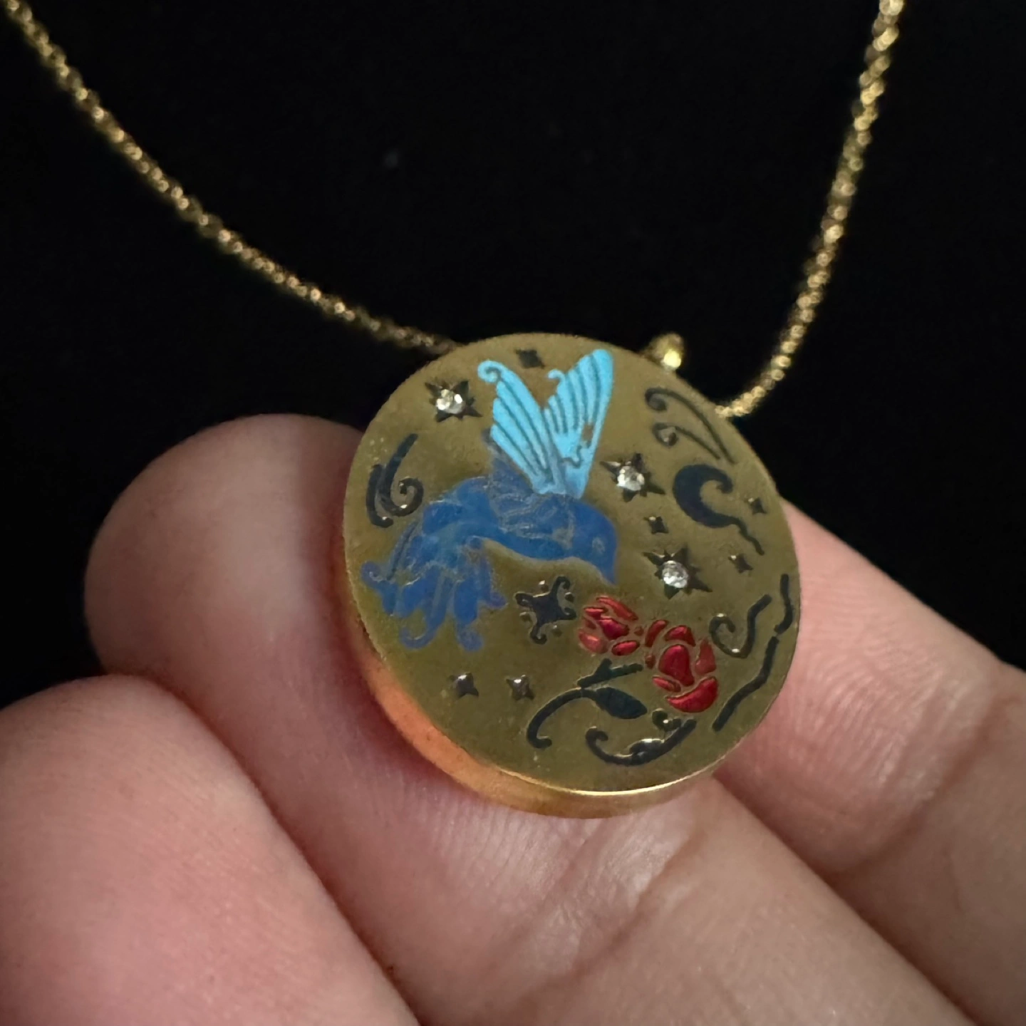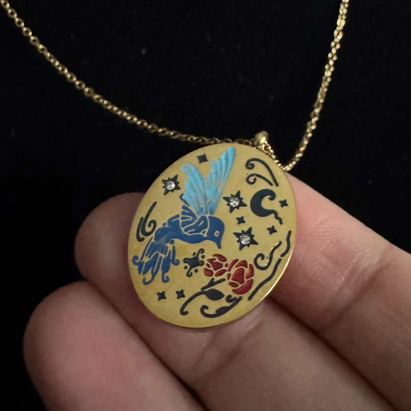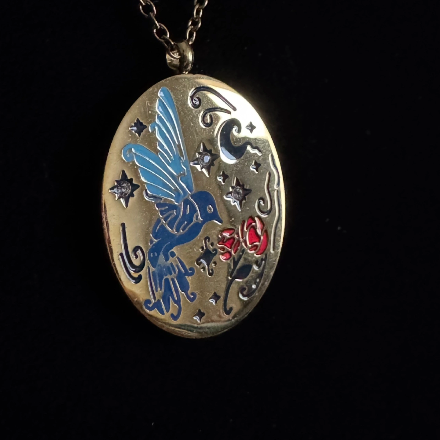 Beautiful gold-toned necklace. Features an oval pendant with enamel detailing. Depicts a blue bird, red rose, and stars. Delicate gold chain included. Gorgeous fairycore/cottagecore vibes. Item is in brand new/ununsed condition and stored in a smoke free and pet free environment. Material: Plated stainless steel and enamel