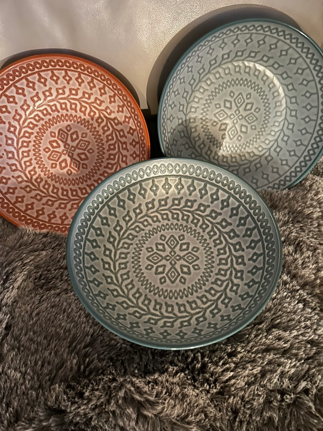 Set of three Mikasa Mosaic stoneware bowls. Beautiful patterned bowls. Dishwasher and microwave safe. Not oven safe. 4$ each or 10 for all