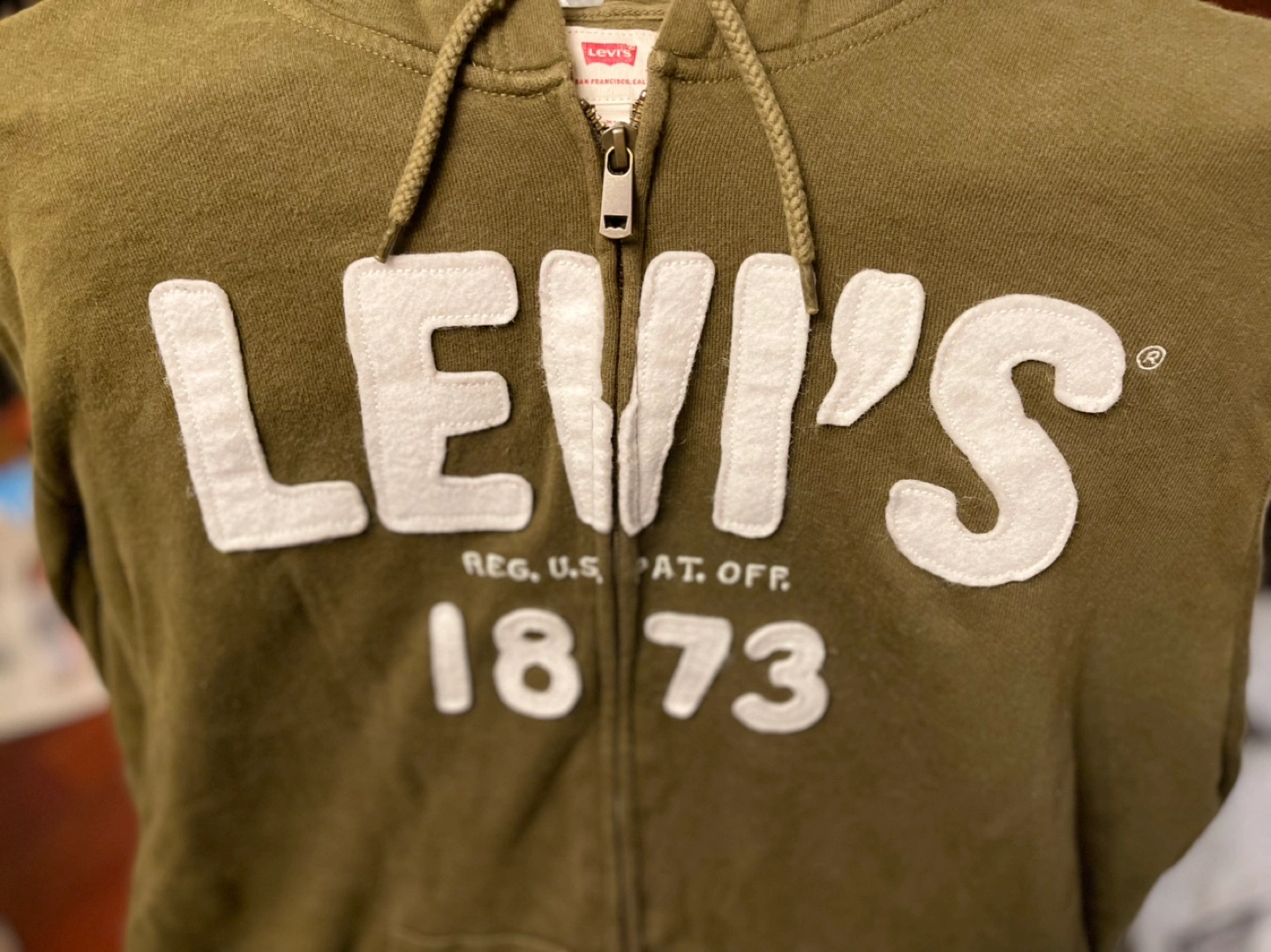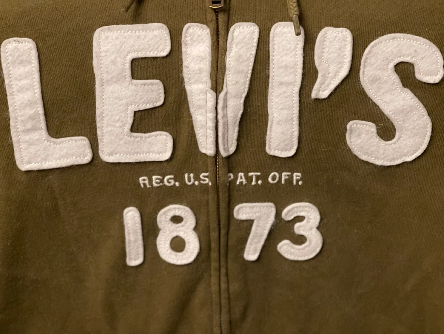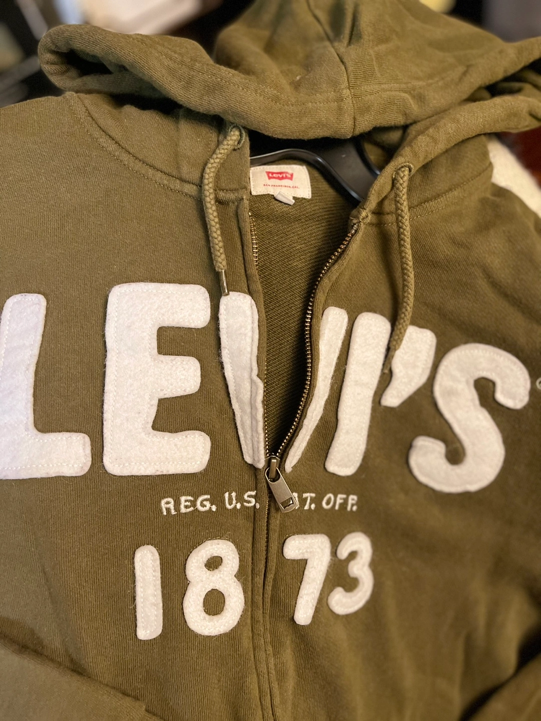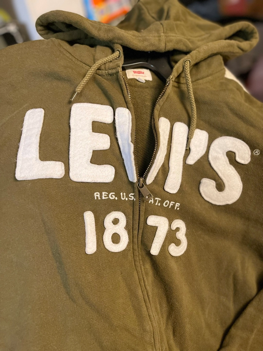 Men's Levi's zip-up hoodie. Olive green colour. Features large white Levi's logo and 1873. Full zip closure. Good condition.