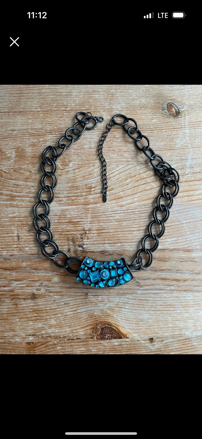 Stunning necklace features a chunky chain and a unique turquoise stone embellishment. Lobster clasp closure. Perfect for adding a touch of sparkle to any outfit.
