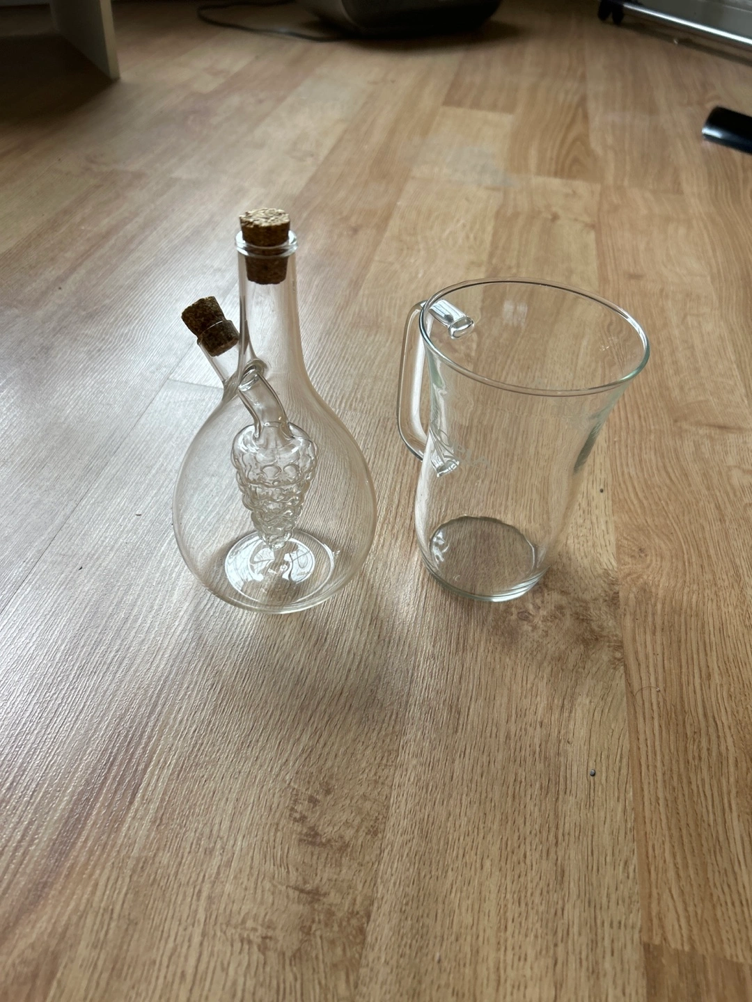 Set includes a glass oil and vinegar dispenser with two separate pour spouts and a small glass mug. Perfect for serving oil and vinegar or other condiments. 1$