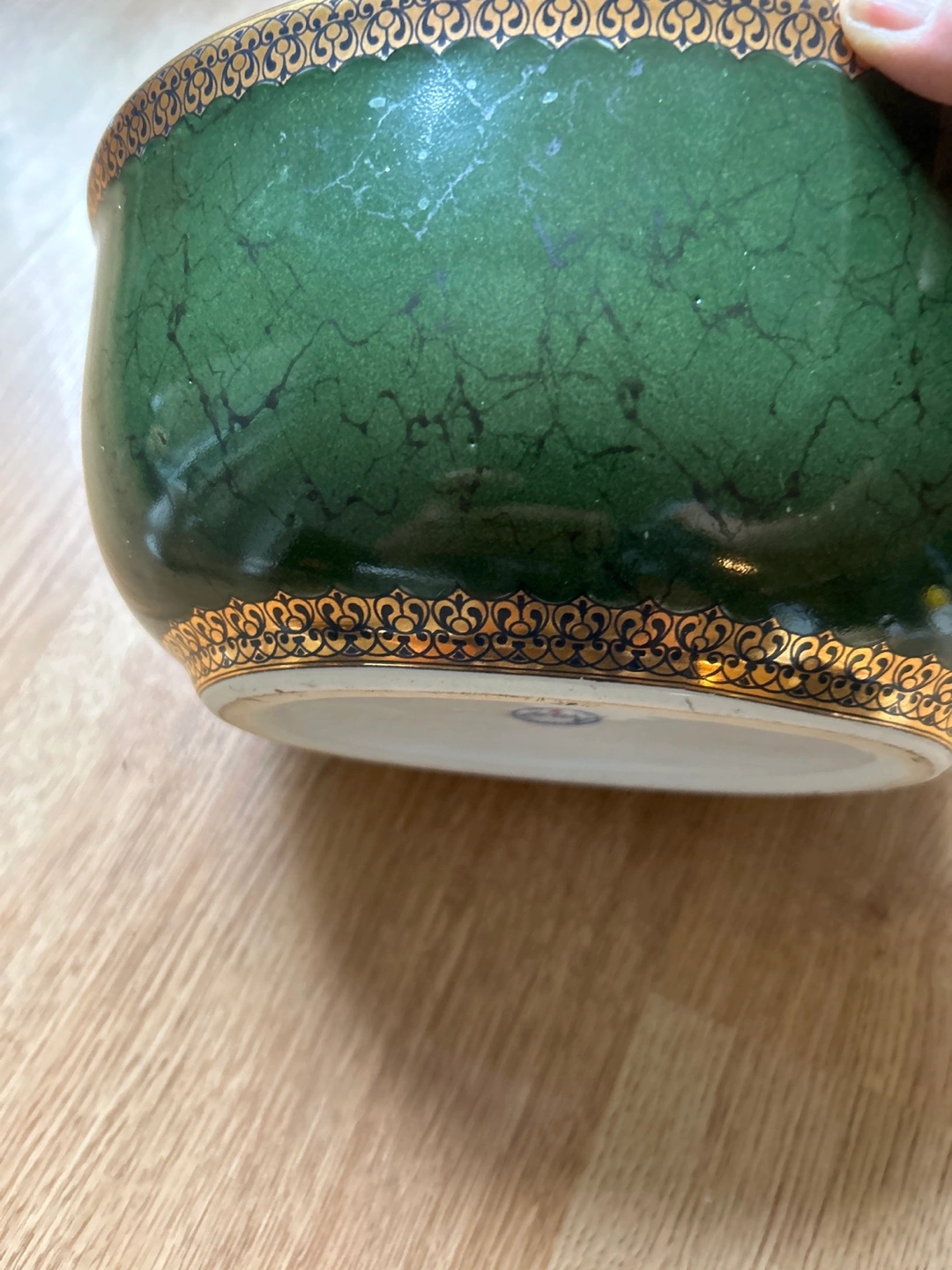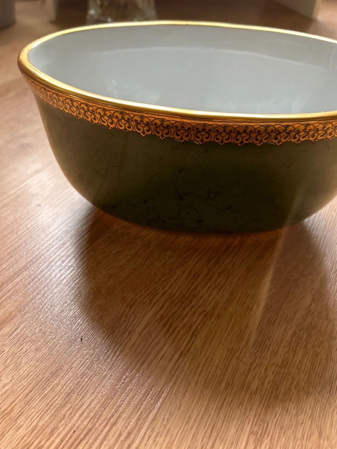 Beautiful large bowl. Dark green with gold detailing. Perfect for a centerpiece or decorative accent. Shows some minor wear.
