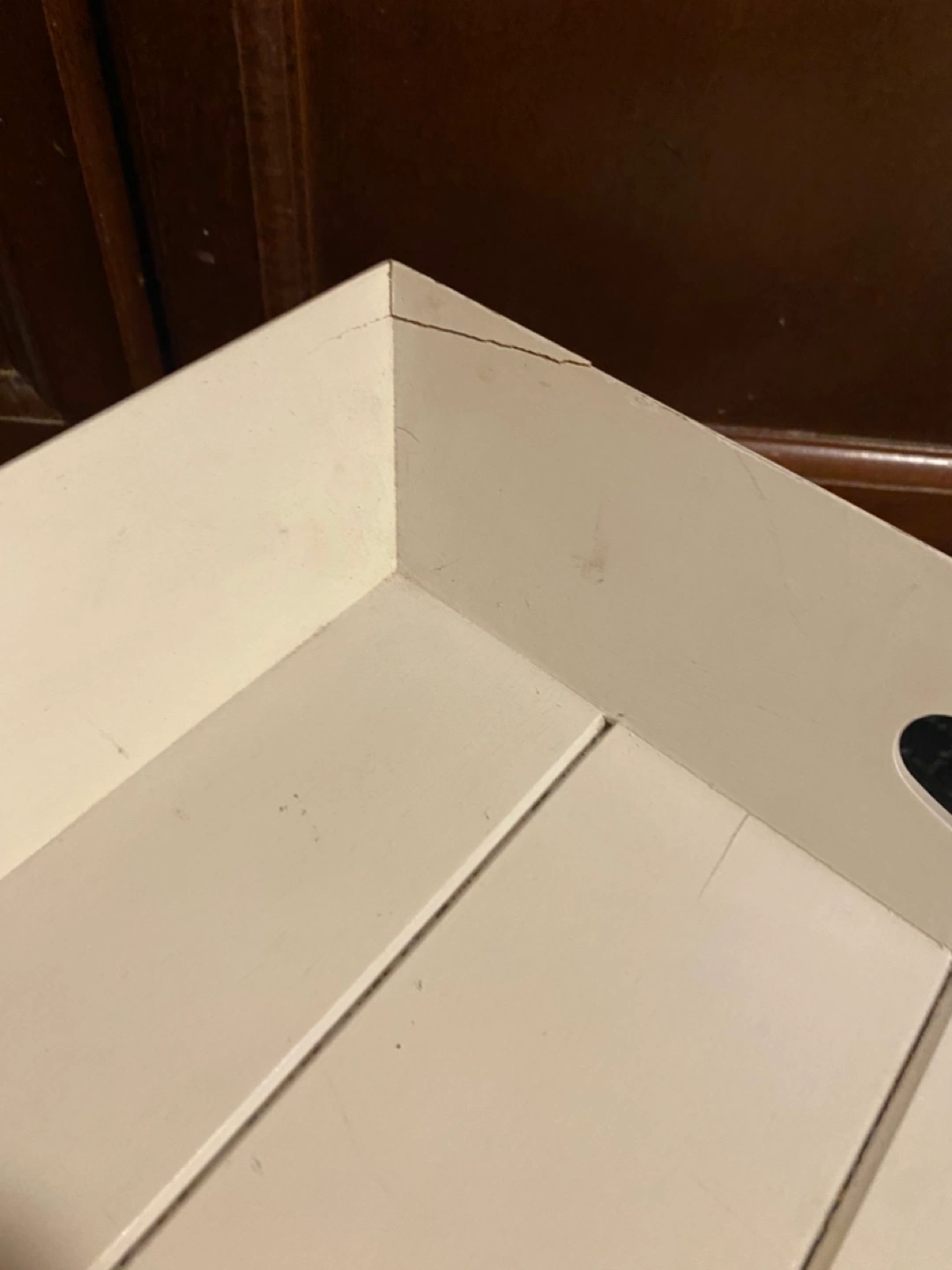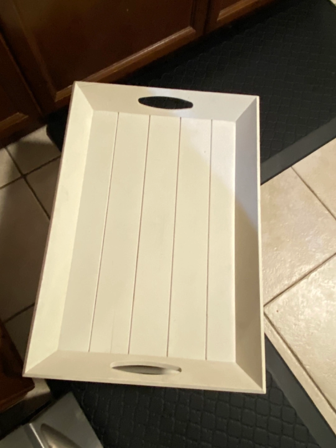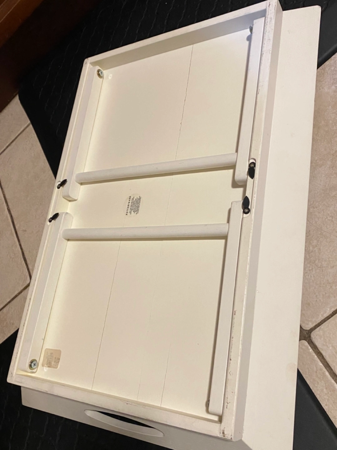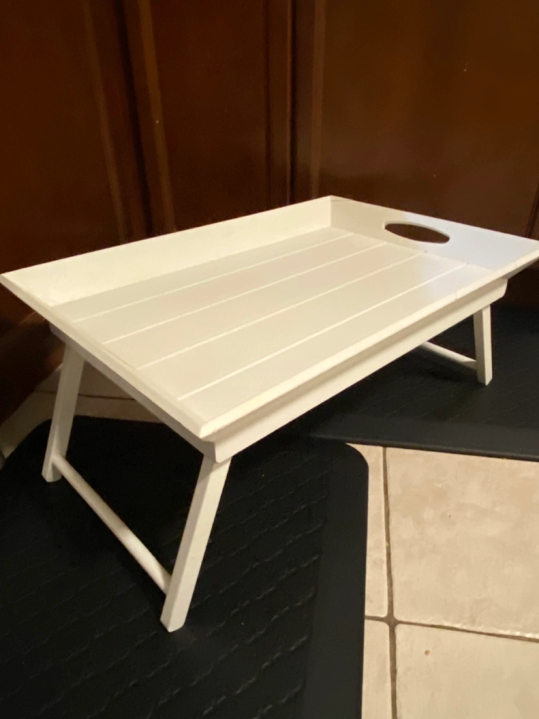 White wooden tray. Features foldable legs. Small crack on corner. Good for serving or as a lap desk.