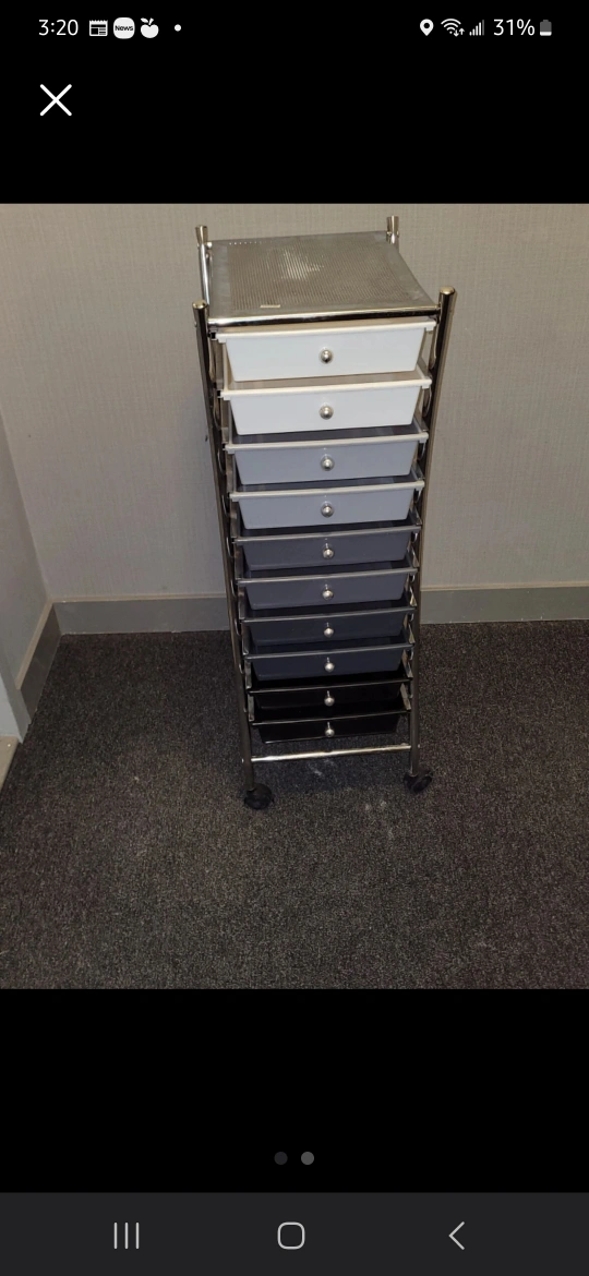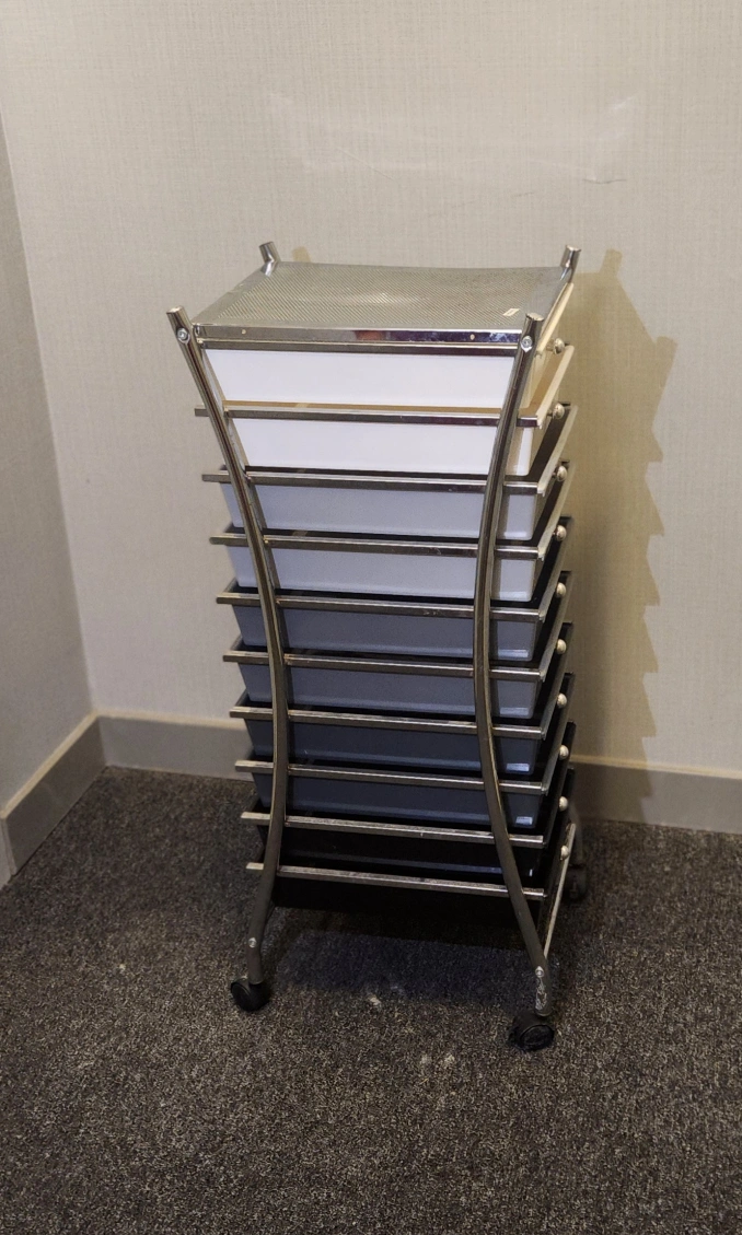 Grey and white plastic drawers. Metal frame. Rolling casters. Great for organizing small items. Cart top doubles as work space! Ten drawers to stash papers, crafts, toys, and other supplies Sleek grayscale drawers and frame with silver pulls Locking wheels keep cart in place Perforated worktop for additional storage Dimensions: 15''L x 11''W x 35''H Drawer Dimensions: 11''W x 2.75''H x 15''D **** Cash Only **** **** Pickup Only **** **** No E-transfers **** **** Serious Offers Only ****