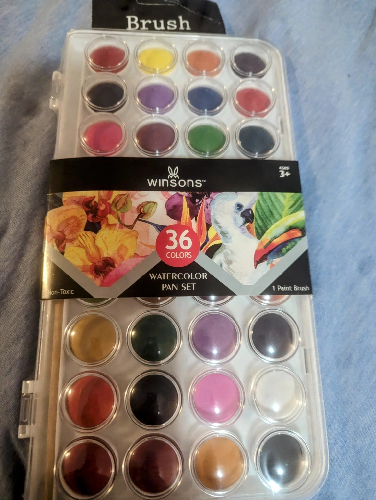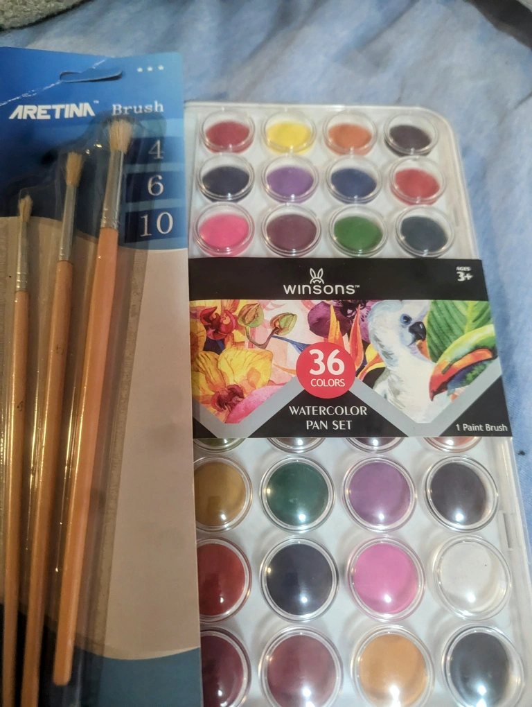 36 water colour set paint set with package of 3 paint brushes. Thirty -six hues water colour paint set by Winsons. Three Paint brushes by ARTIMA 4 / 6/ 10 mm sizes. I have a set myself, the paint is high quality. I am giving any artist or creative side , Karrot's members a real deal! π These sell for over $16 else where. +++ I will even through in a paint pallet for free from Artistic Series +++ Please check out my other items. Thank you.