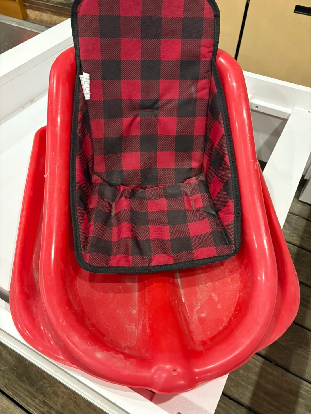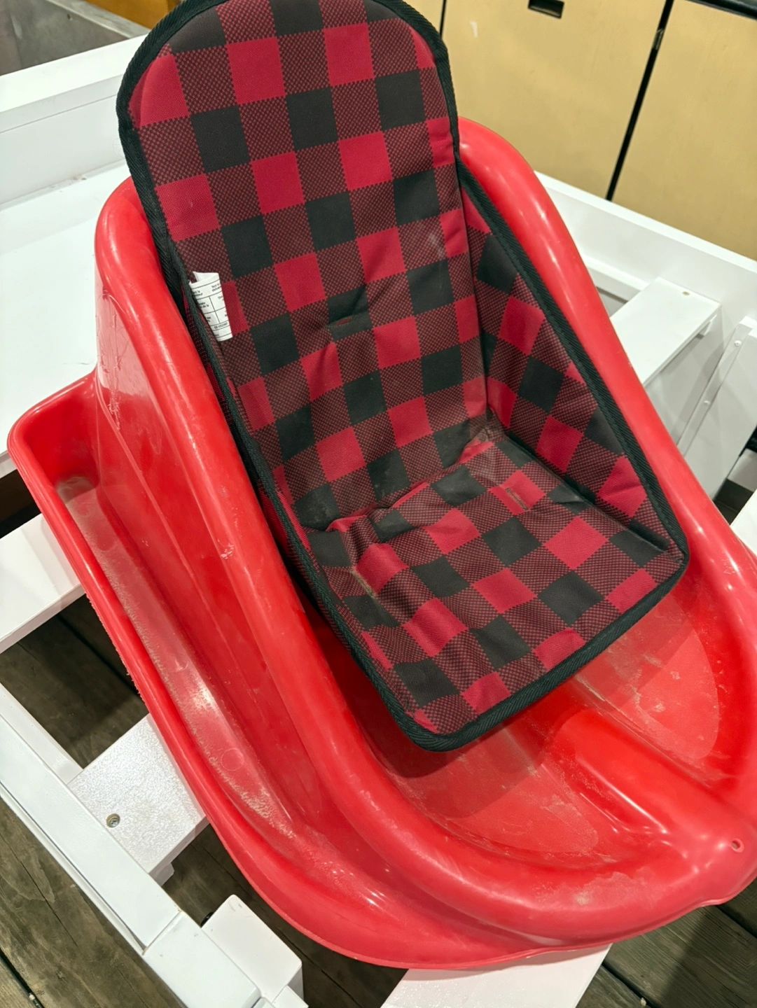 Red plastic sled. Features a removable padded seat with a black and red buffalo check pattern. Suitable for children. Shows some signs of wear.
