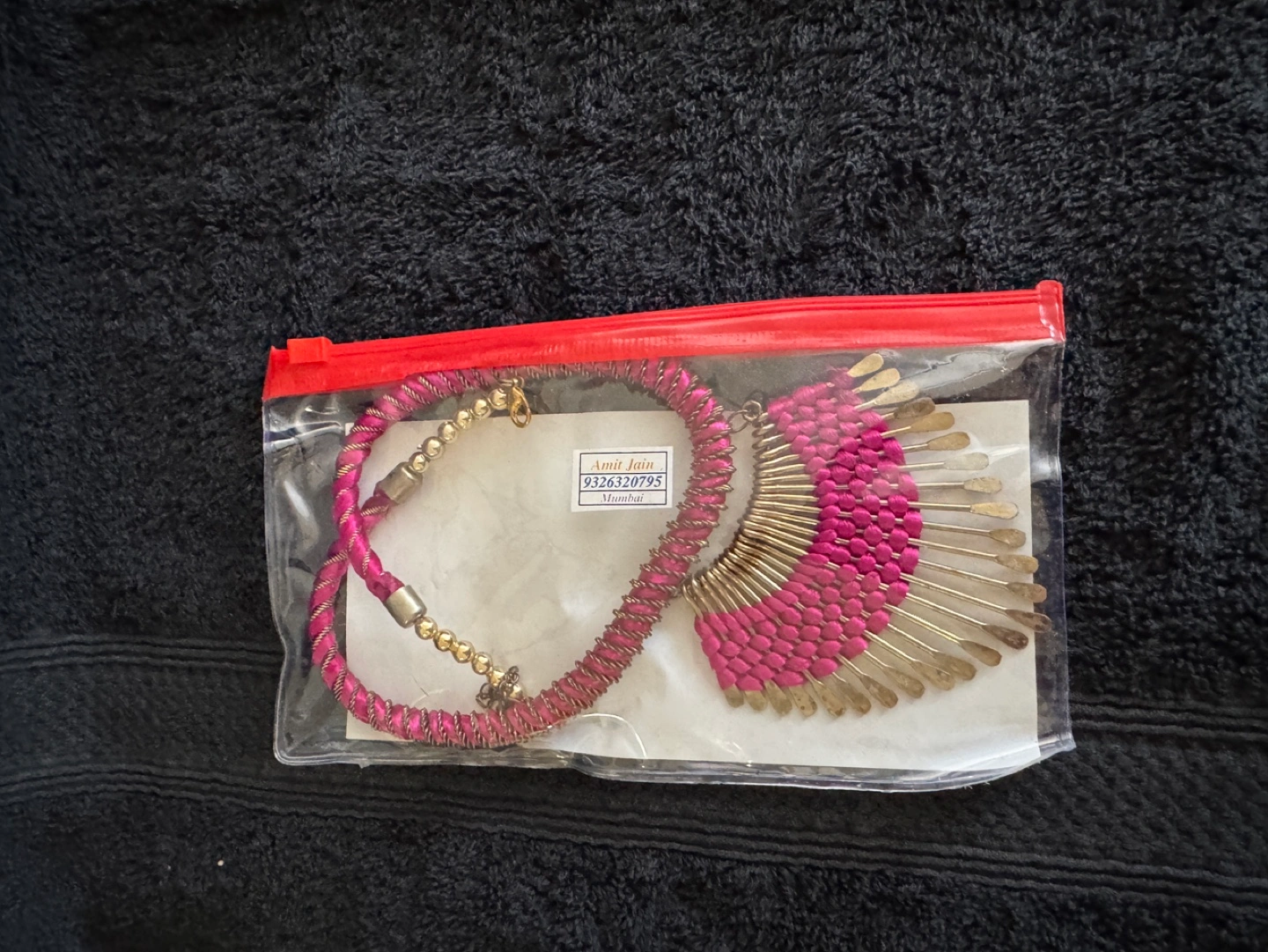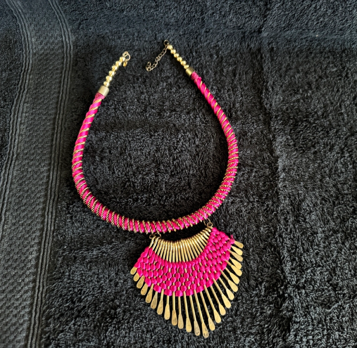 Unique pink necklace. Features woven cord and brass accents. Pendant design. Gold clasp.Pickup near bloor and dixie
