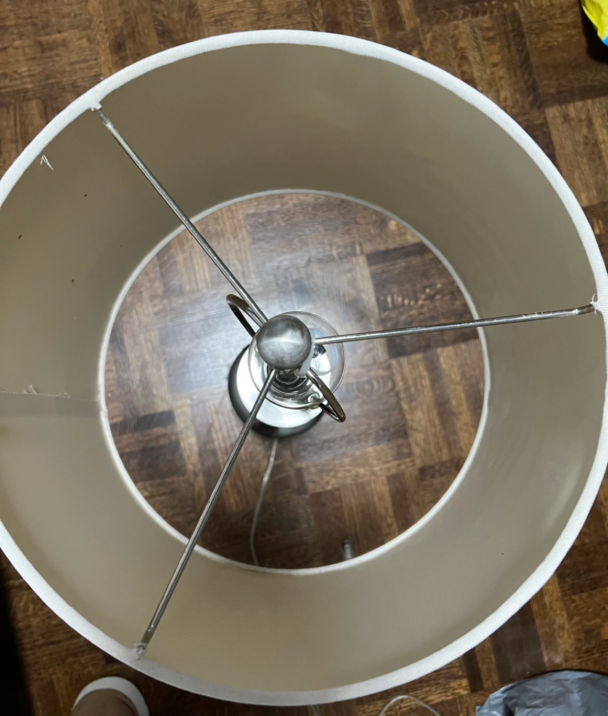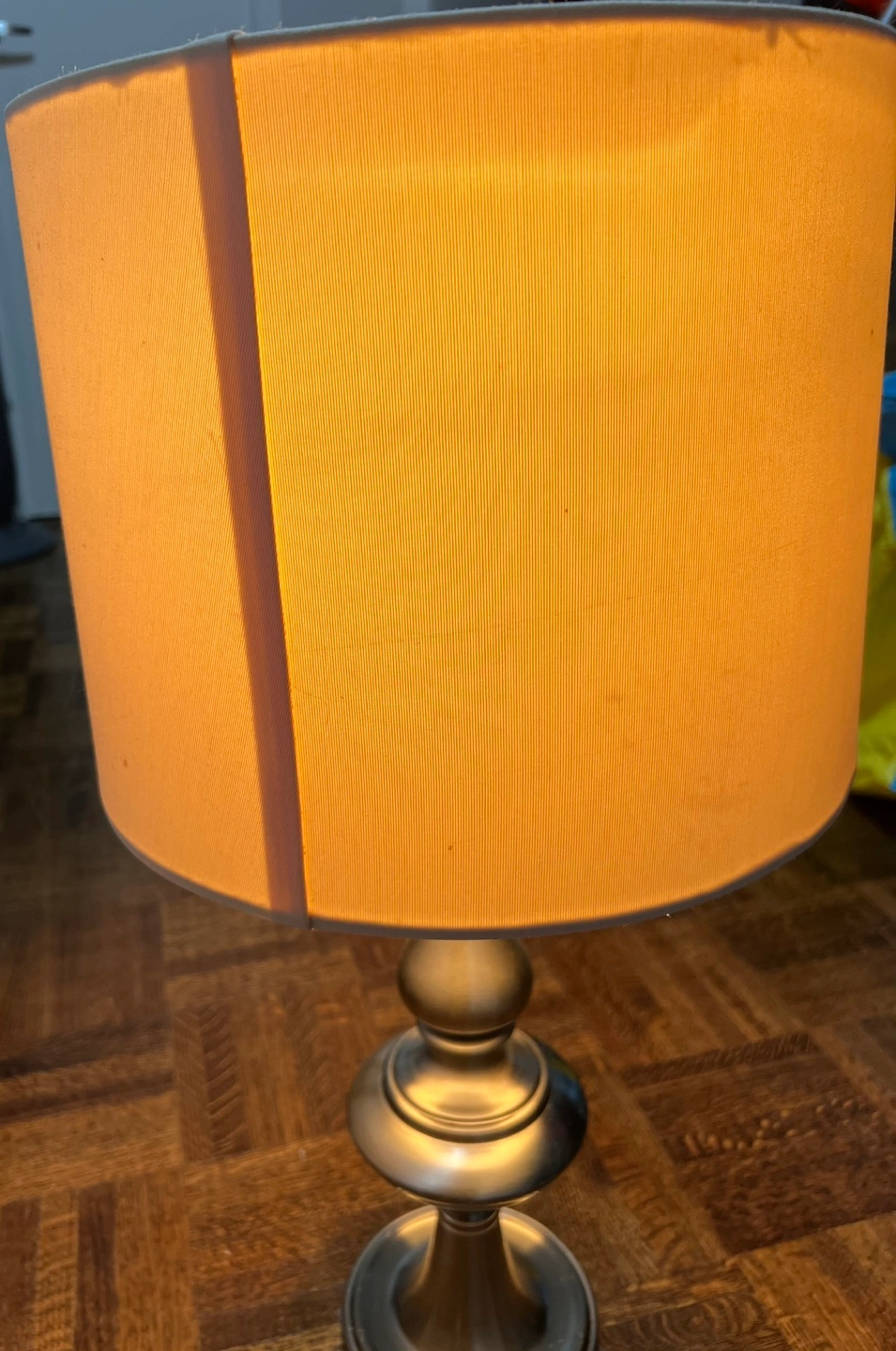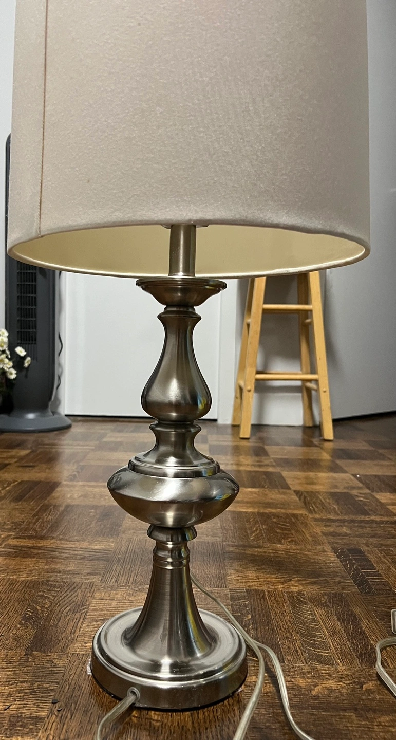 Beautiful brushed nickel table lamp. Features a classic design and an off-white fabric shade. Provides soft ambient lighting. Great for a bedside table or living room.
