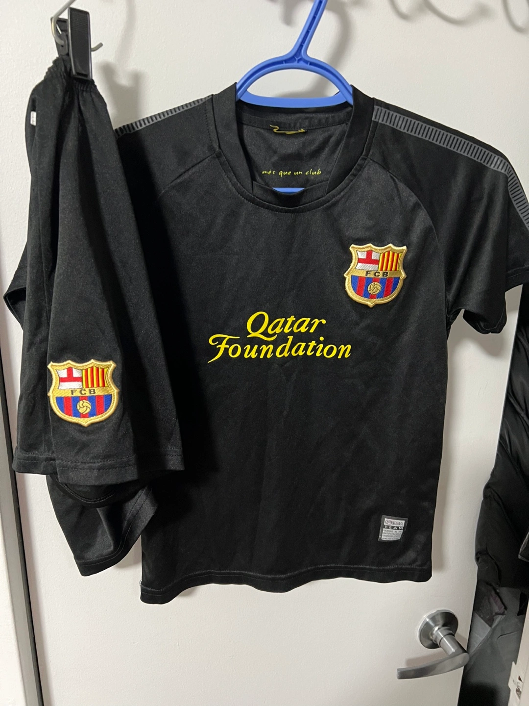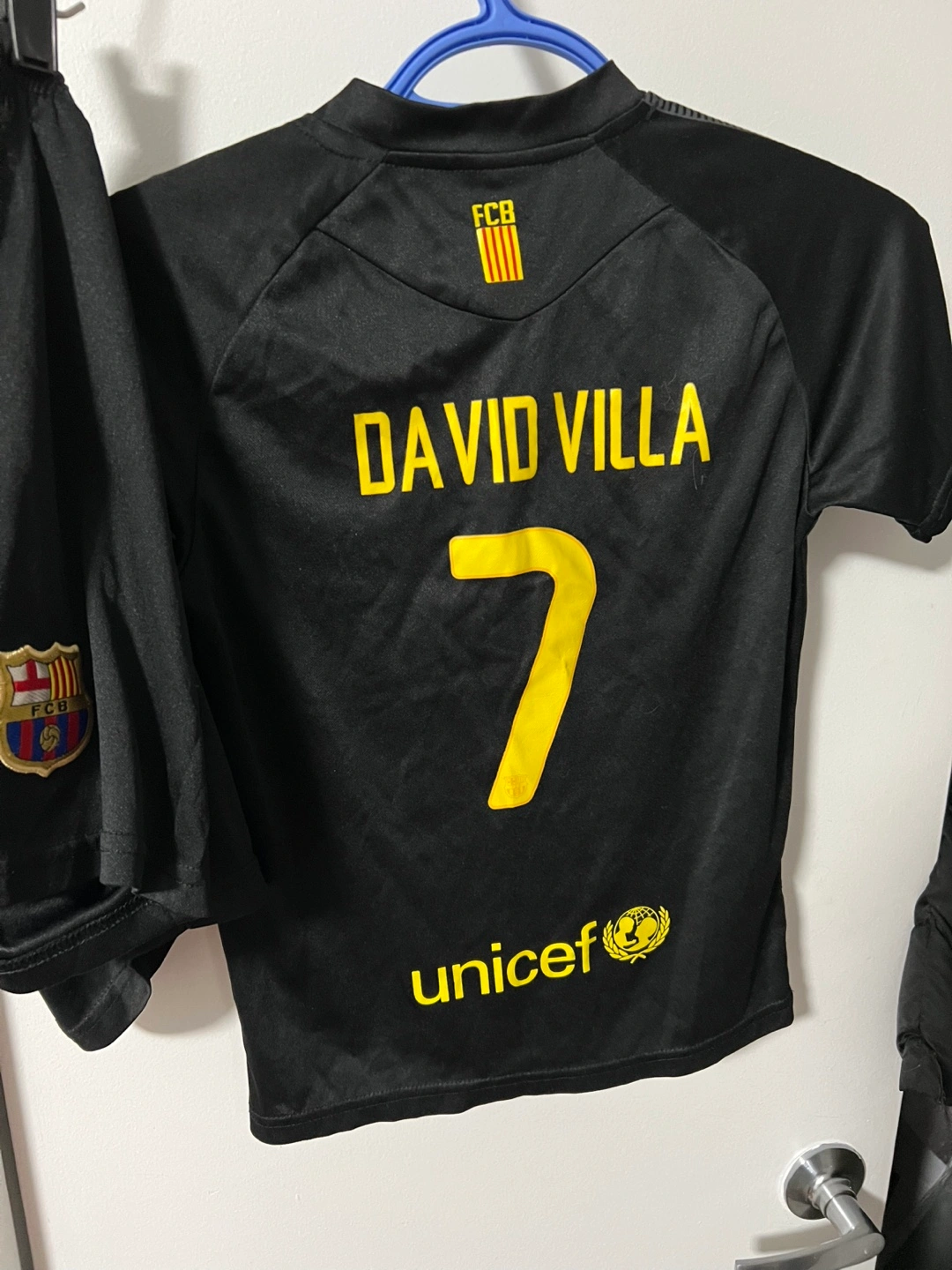 Black youth-sized FC Barcelona soccer kit. Features David Villa's name and number 7 on the back. Qatar Foundation and UNICEF logos present. Includes jersey and shorts.