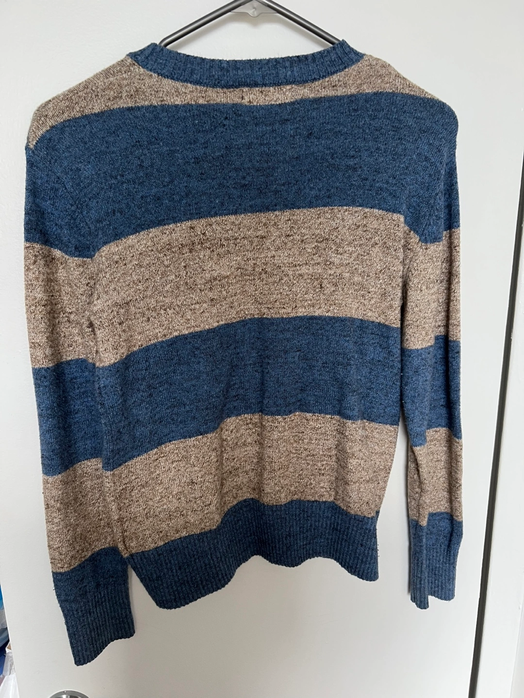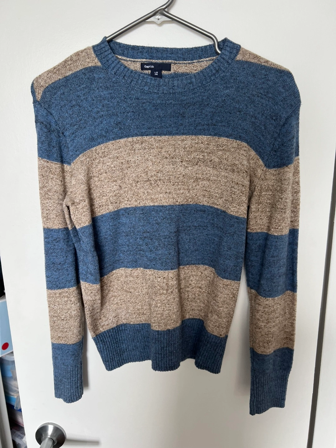 Kids long-sleeved sweater. Blue and beige horizontal stripes. Crew neck. Size Large.size10