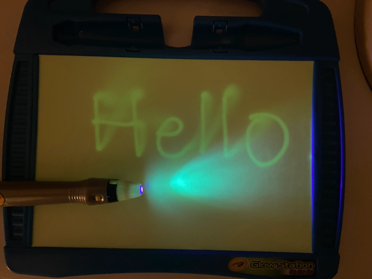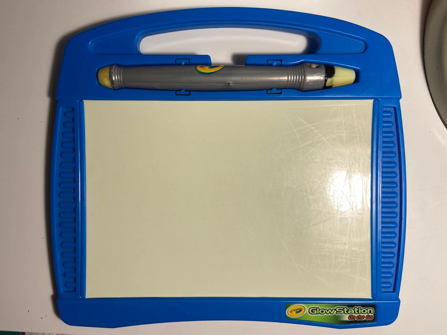 Portable light-up drawing board. Includes a special pen. Great for kids. Some minor surface scratches. New batteries needed for pen.