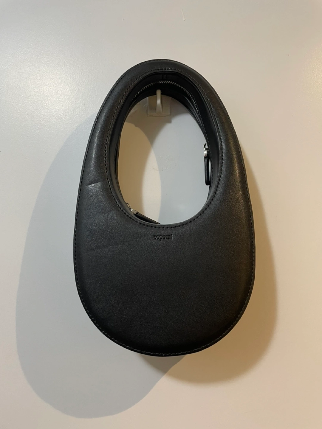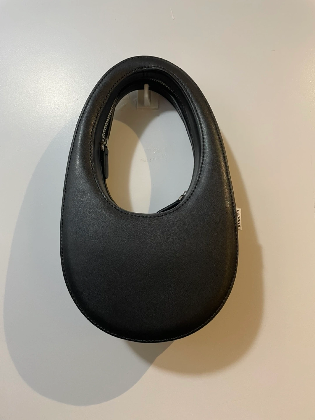 Stylish black leather handbag. Oval shape. Zipper closure. Small size, perfect for evenings.