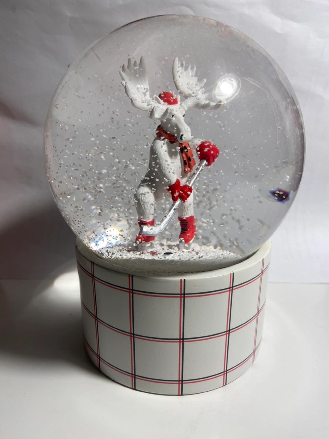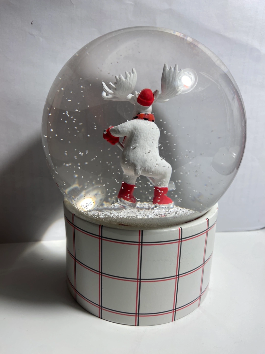Adorable snow globe featuring a moose playing hockey. Plays music. Features a plaid base. Collectible item. Coin for size Price negotiable