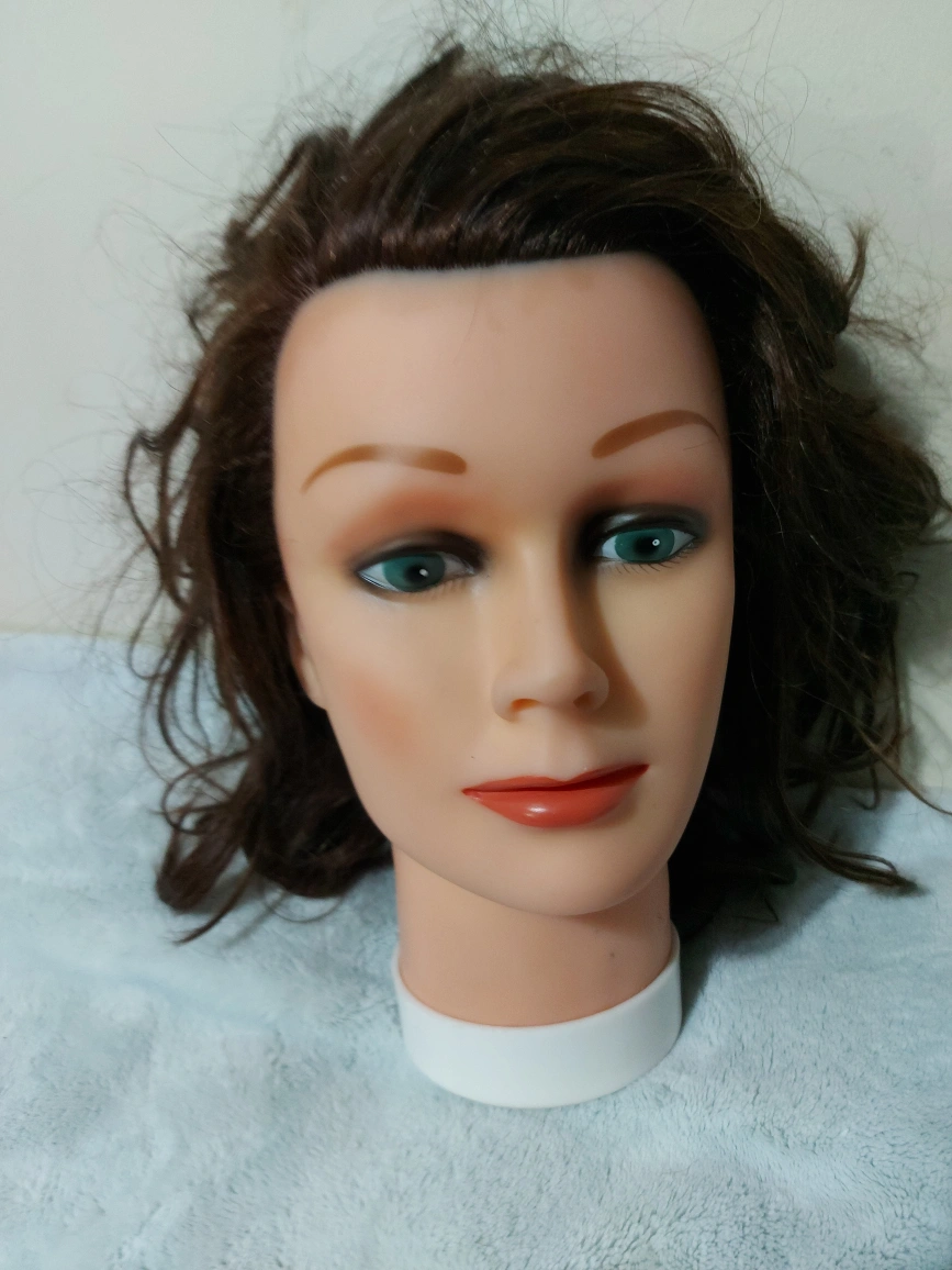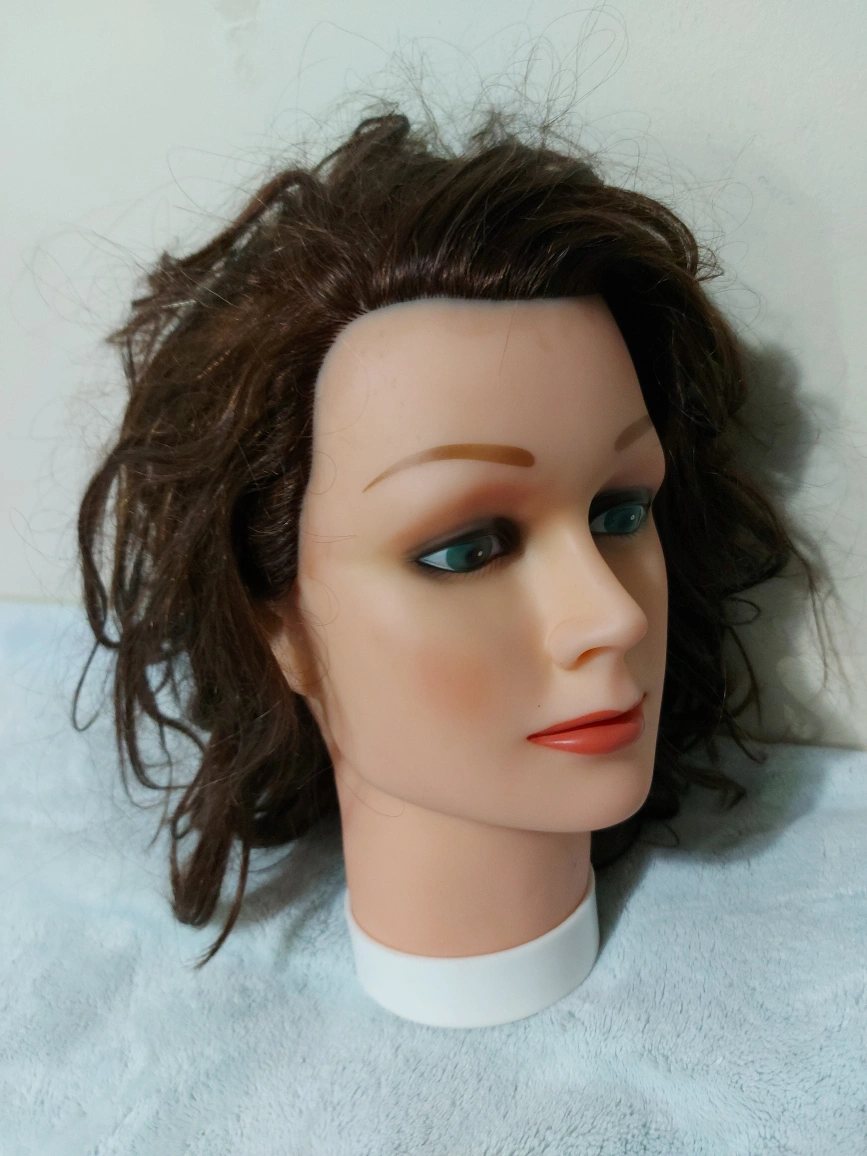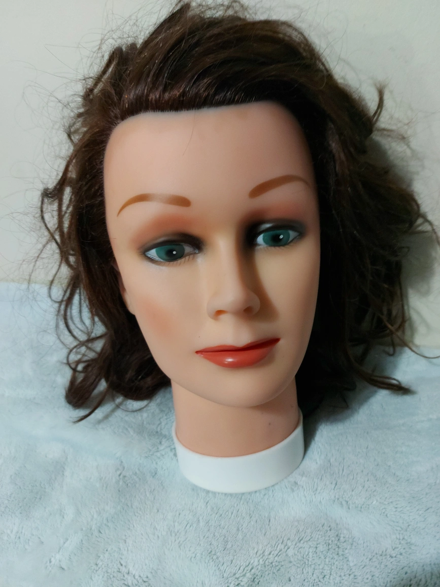 Female mannequin head. Brown, wavy hair. Great for hairstyling practice or display. Used condition.